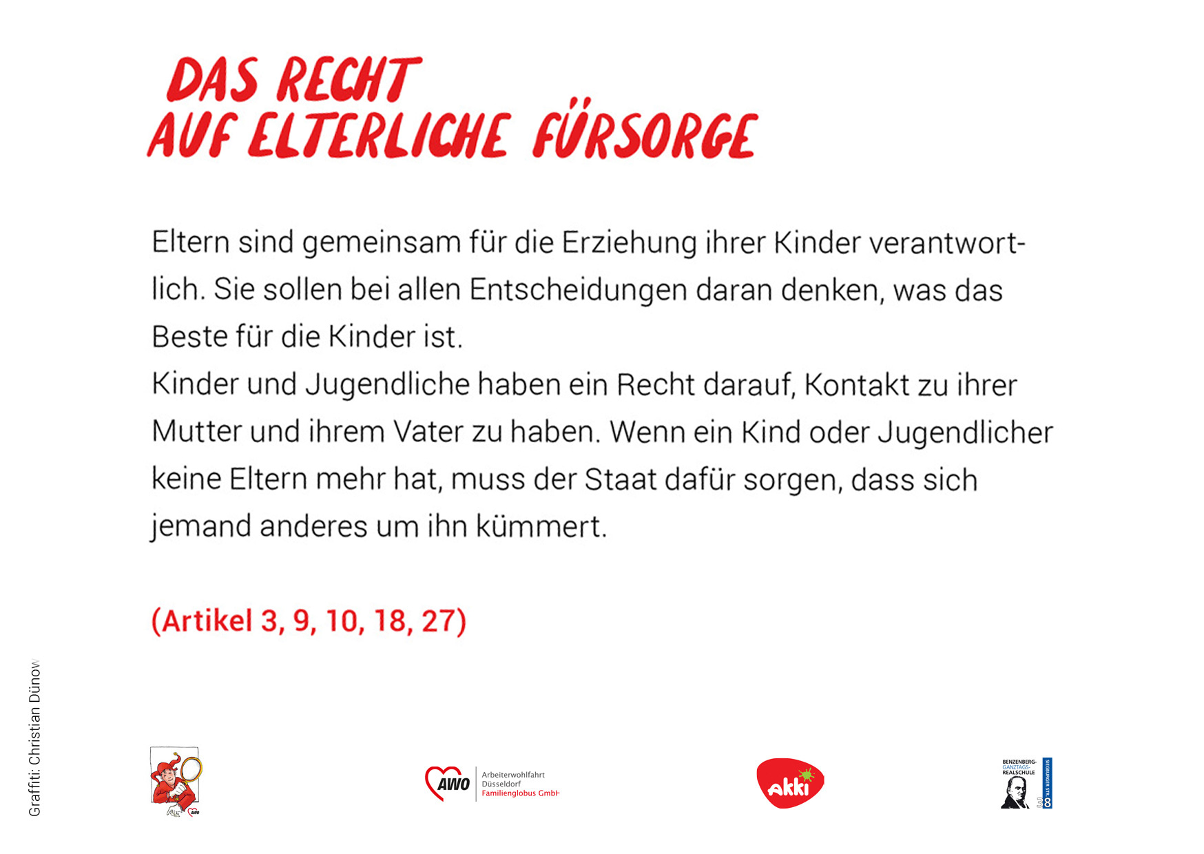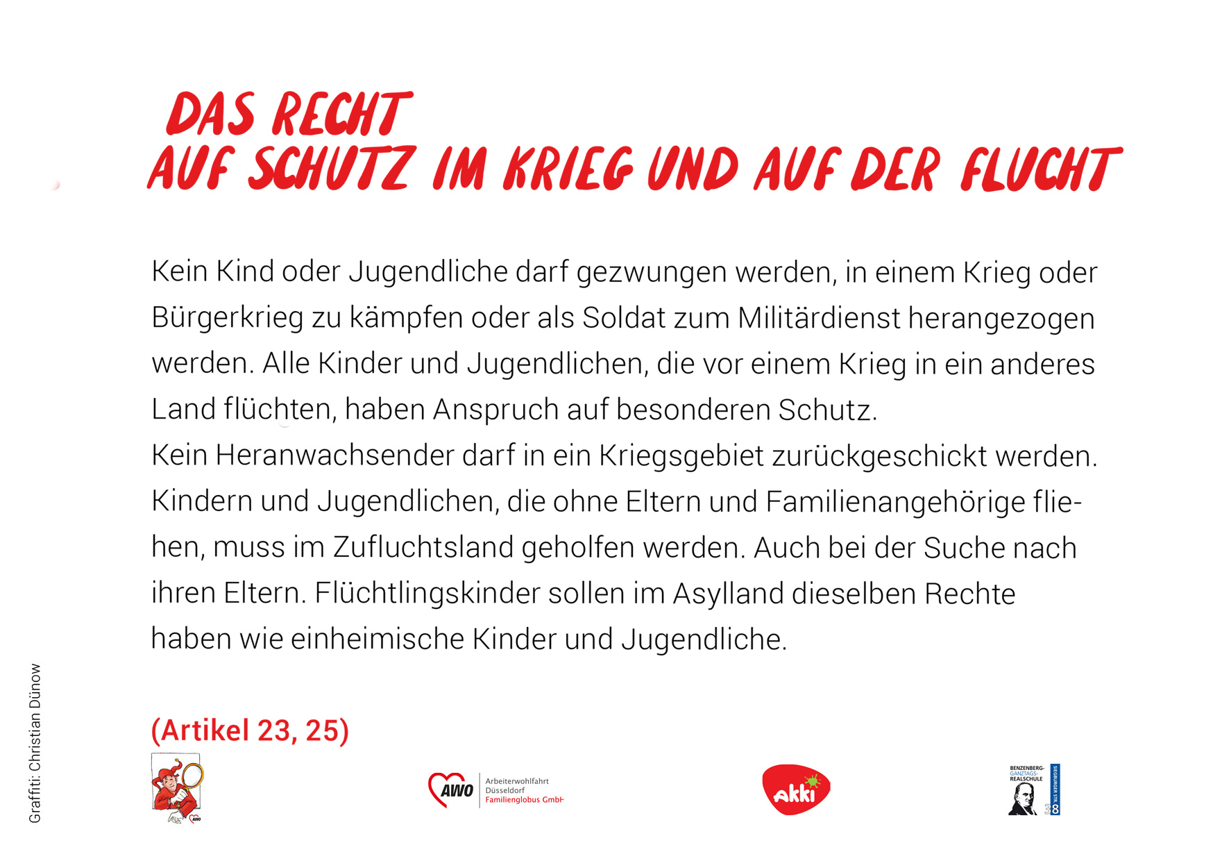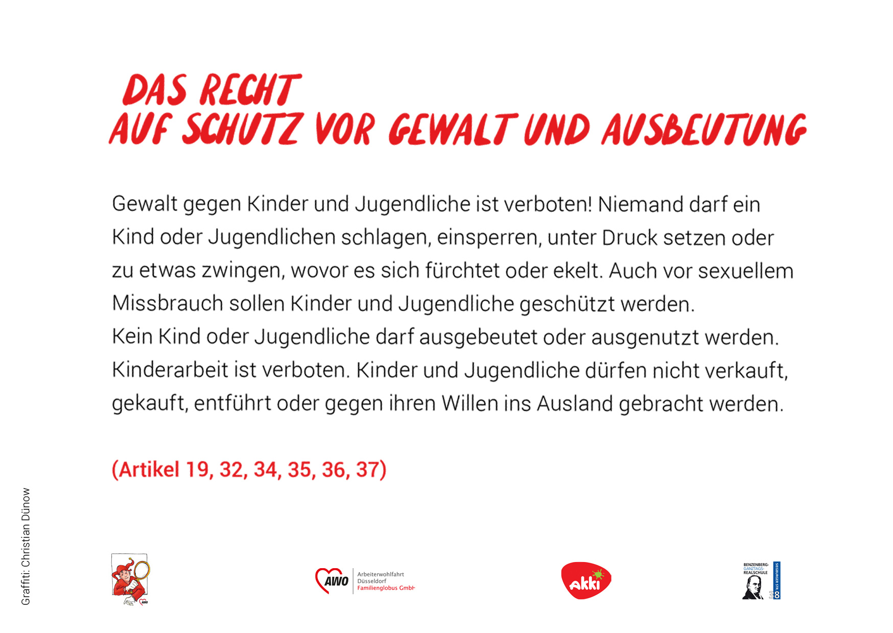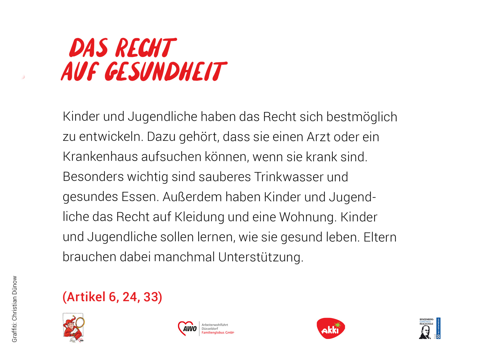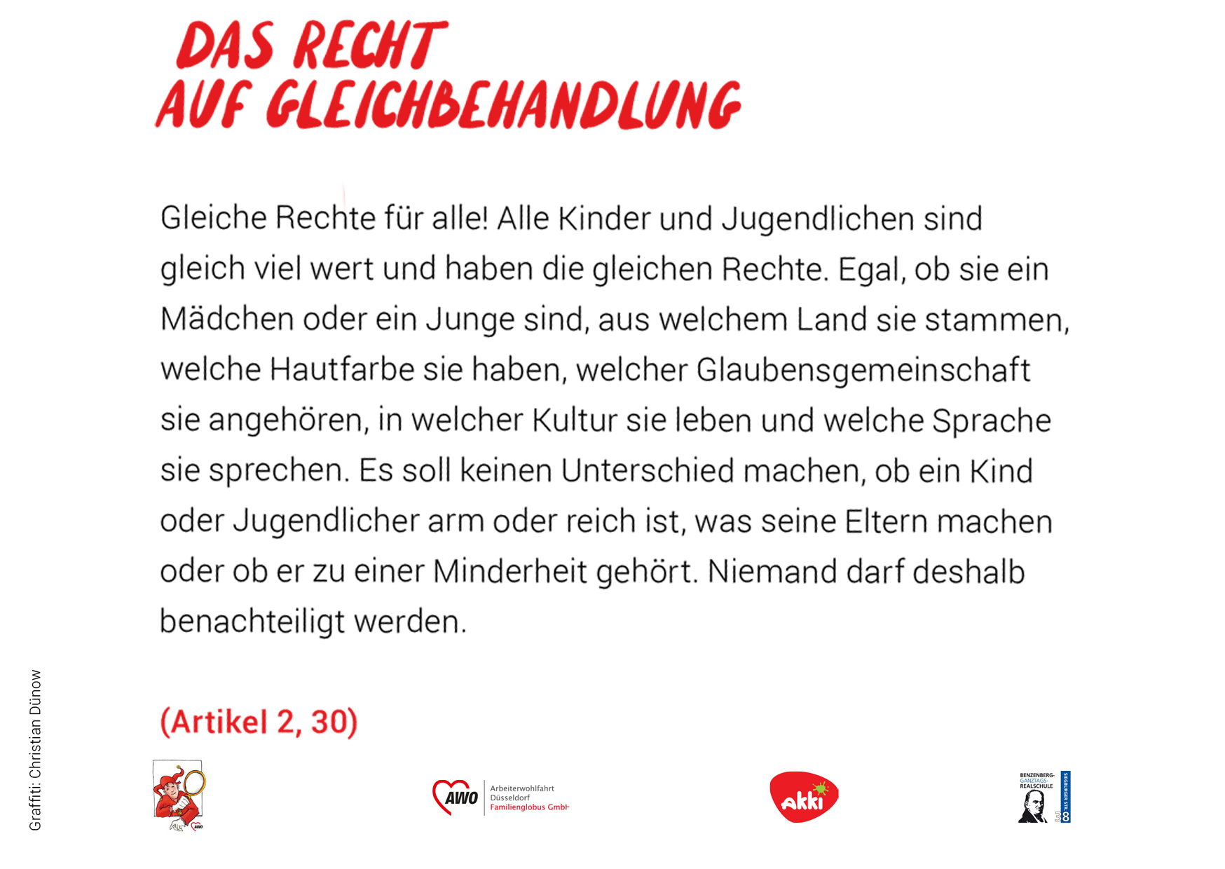 Das heißt, sie sollen gesund und glücklich aufwachsen können. In Deutschland gilt man bis zum 18. Lebensjahr als Kind oder Jugendlicher. Die UN-Konvention umfasst 54 Artikel. Wir haben versucht, diese kurz und verständlich zusammenzufassen. In einem Kooperations-Projekt mit dem Akki e.V. und den Schüler*innen des Kunstkurses der Benzenberg-Realschule sind die Fotos zu den einzelnen Rechten entstanden.