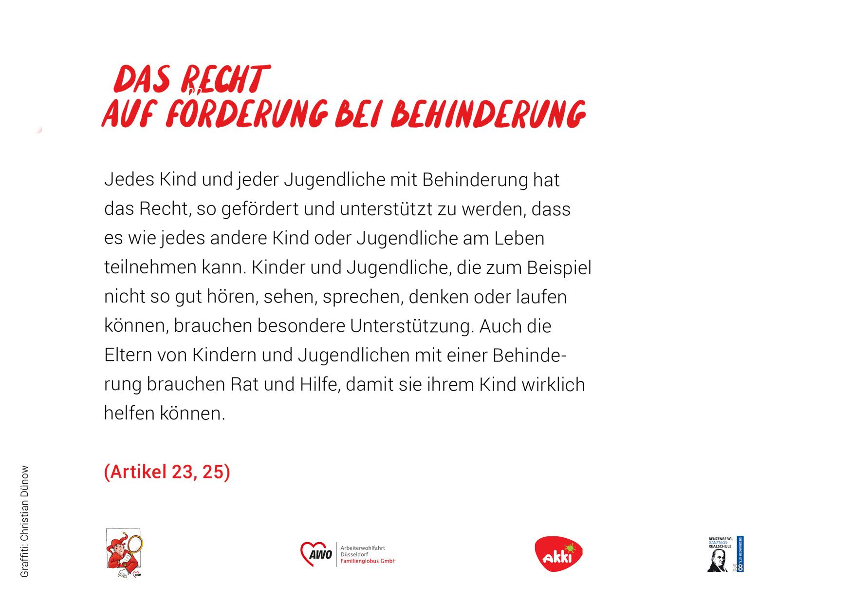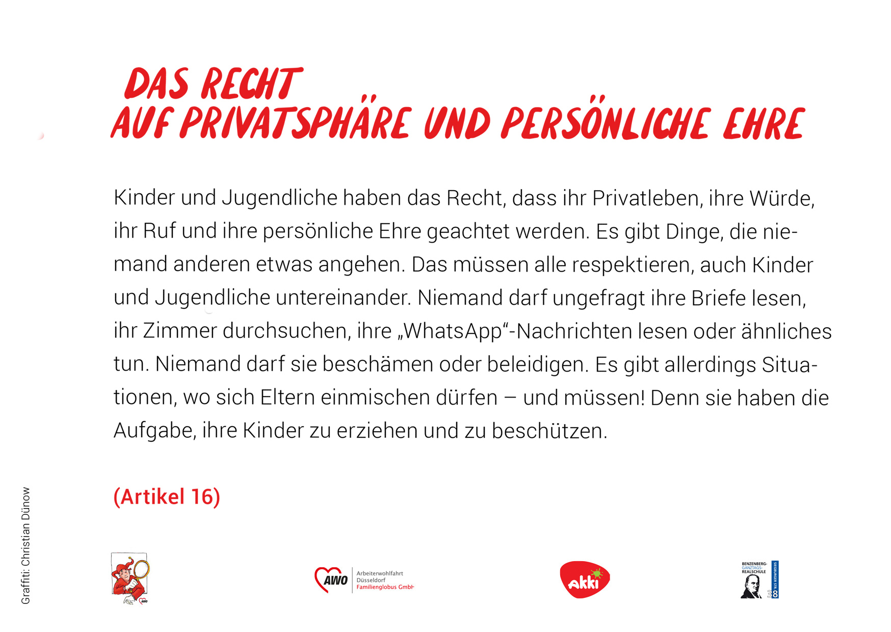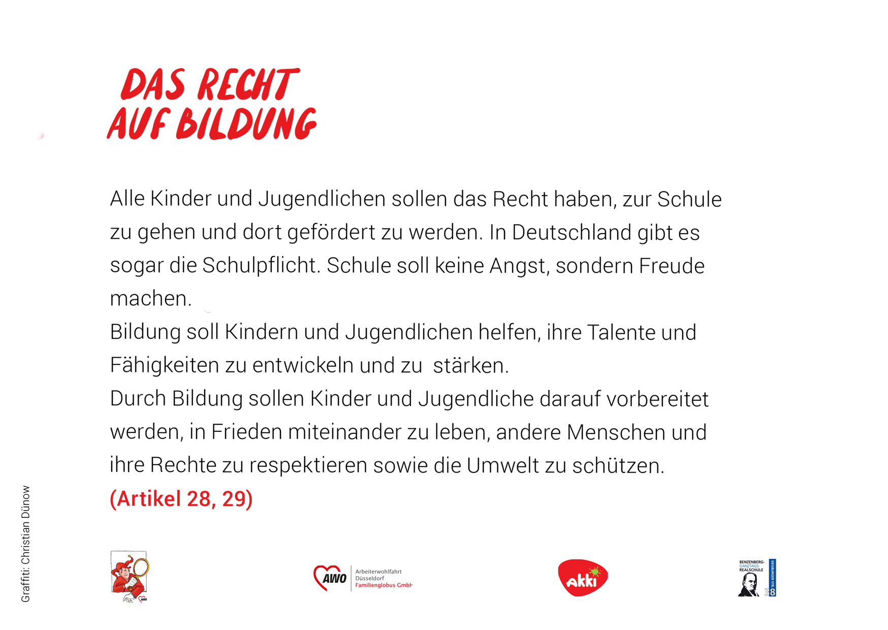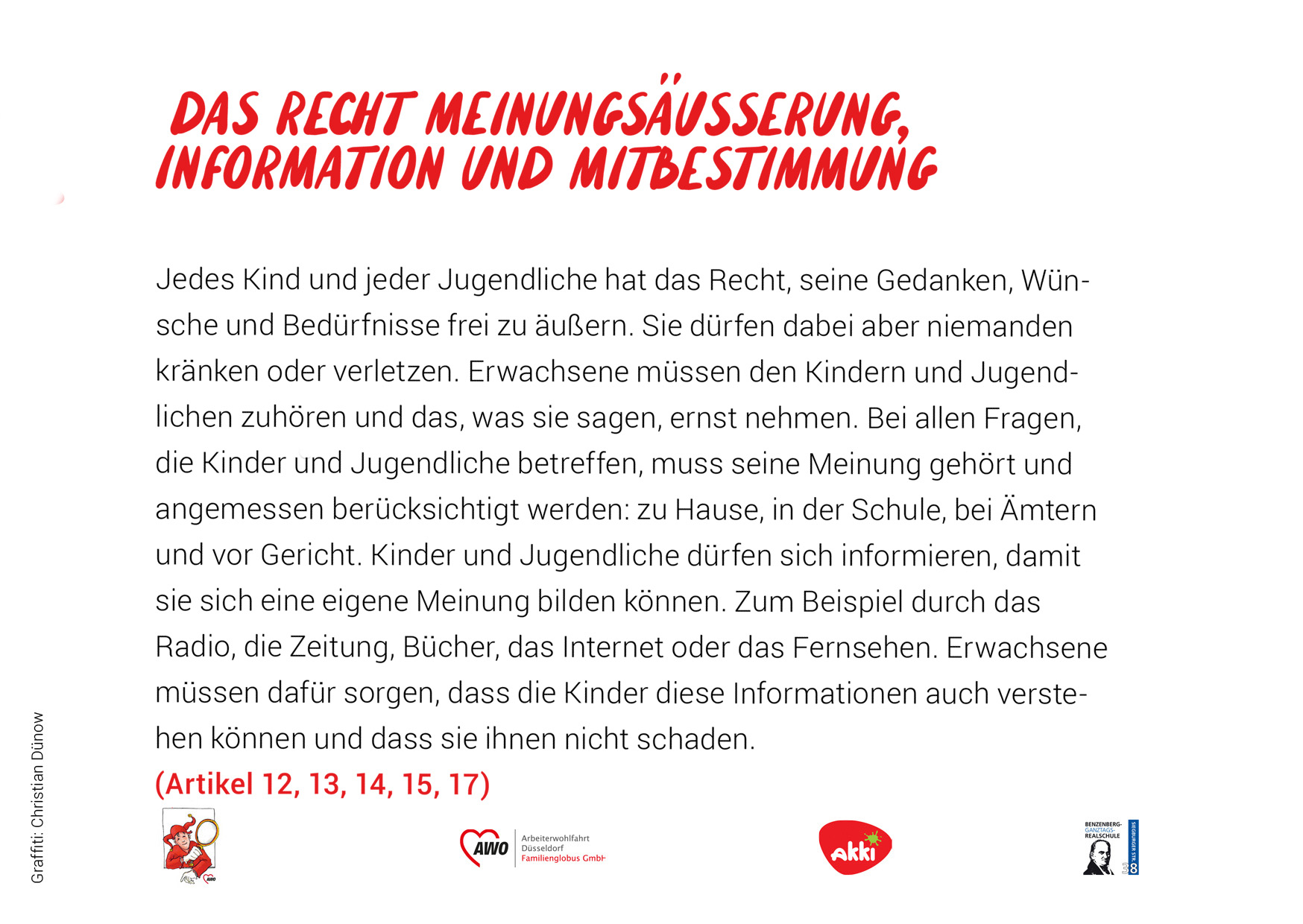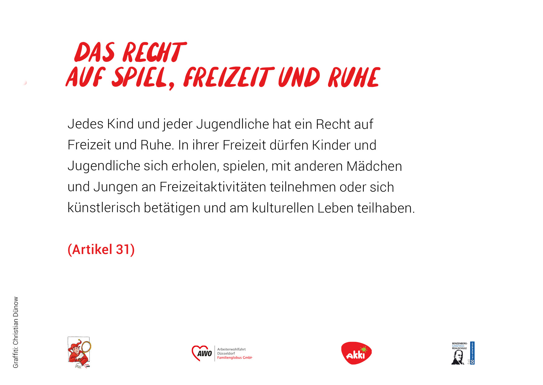Das heißt, sie sollen gesund und glücklich aufwachsen können. In Deutschland gilt man bis zum 18. Lebensjahr als Kind oder Jugendlicher. Die UN-Konvention umfasst 54 Artikel. Wir haben versucht, diese kurz und verständlich zusammenzufassen. In einem Kooperations-Projekt mit dem Akki e.V. und den Schüler*innen des Kunstkurses der Benzenberg-Realschule sind die Fotos zu den einzelnen Rechten entstanden.