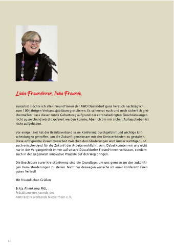 zunächst möchte ich allen Freund*innen der AWO Düsseldorf ganz herzlich nachträglich zum 100-jährigen Verbandsjubiläum gratulieren. Es schmerzt euch und mich sicherlich glei- chermaßen, dass dieser runde Geburtstag aufgrund der coronabedingten Einschränkungen nicht ausreichend würdig gefeiert werden konnte. Aber ich bin mir sicher: Aufgeschoben ist nicht aufgehoben.