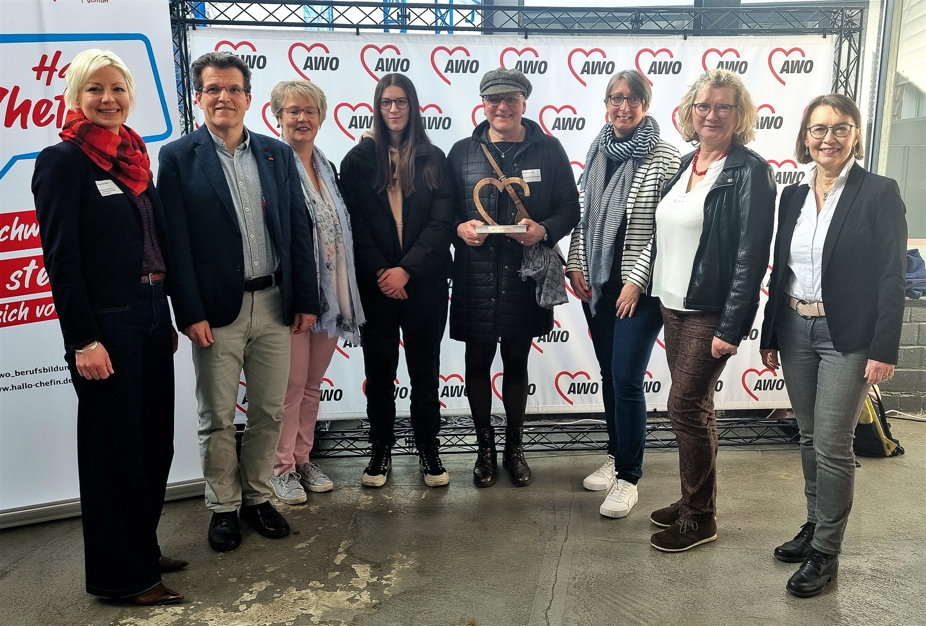 Francis Breidenstein zeigte sich gerührt. „Für unseren Betrieb ist es eine Herzensangelegenheit, junge Menschen mitzunehmen, die einen zweiten Anlauf benötigen. Im Leben liegen ja schon genug Steine im Weg und manchen Brocken kann man einfach nicht alleine zur Seite rollen“, so die Preisträgerin. Das „Ausbildungsherz“ ist fester Bestandteil der Azubi-Messe „Hallo Chef*in“, bei der das AWO Berufs-bildungszentrum Unternehmen und Auszubildende in direkten Kontakt bringt. Zudem haben Unter-nehmen die Möglichkeit über eine eigens eingerichtete Webseite (www.hallo-chefin.de), potentielle Auszubildende und Praktikant*innen mit aussagekräftigen Steckbriefen virtuell kennenzulernen.