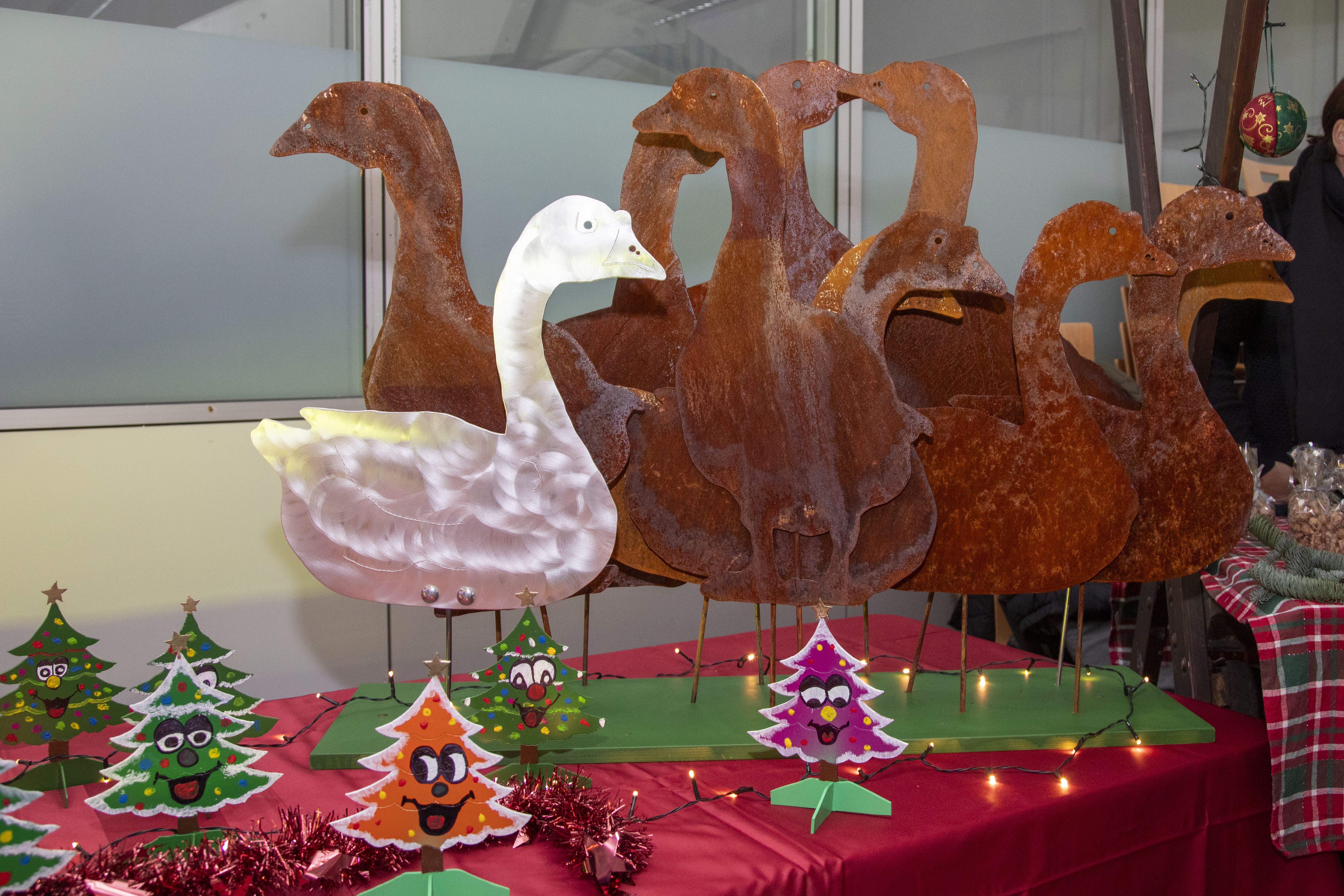 Die Florist*innen des BBZ präsentierten eine vielfältige Auswahl an festlichen Gestecken und Kränzen in verschiedenen Farben und Formen. Fast im Minutentakt gingen die vorweihnachtlichen Geschenke über den Verkaufstresen. Auch die handgefertigten Stücke aus Holz und Metall sowie kreative und nachhaltige Präsente aus Stoff, Papier und Raysin fanden ihre Käufer*innen. Besonders charmant: die großformatigen Gänse aus Metall und die liebevoll bemalten Metall-Weihnachtsbäume.