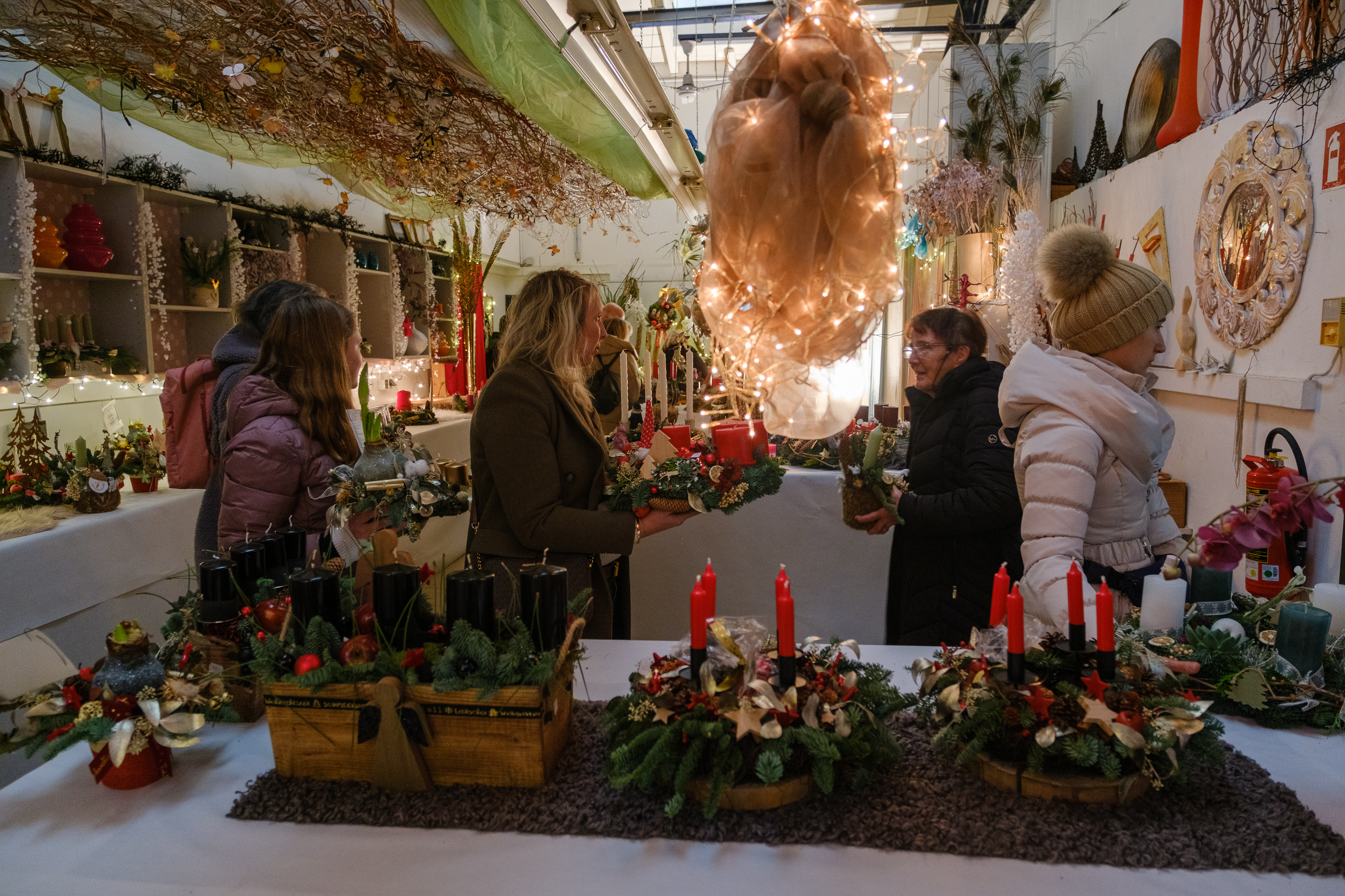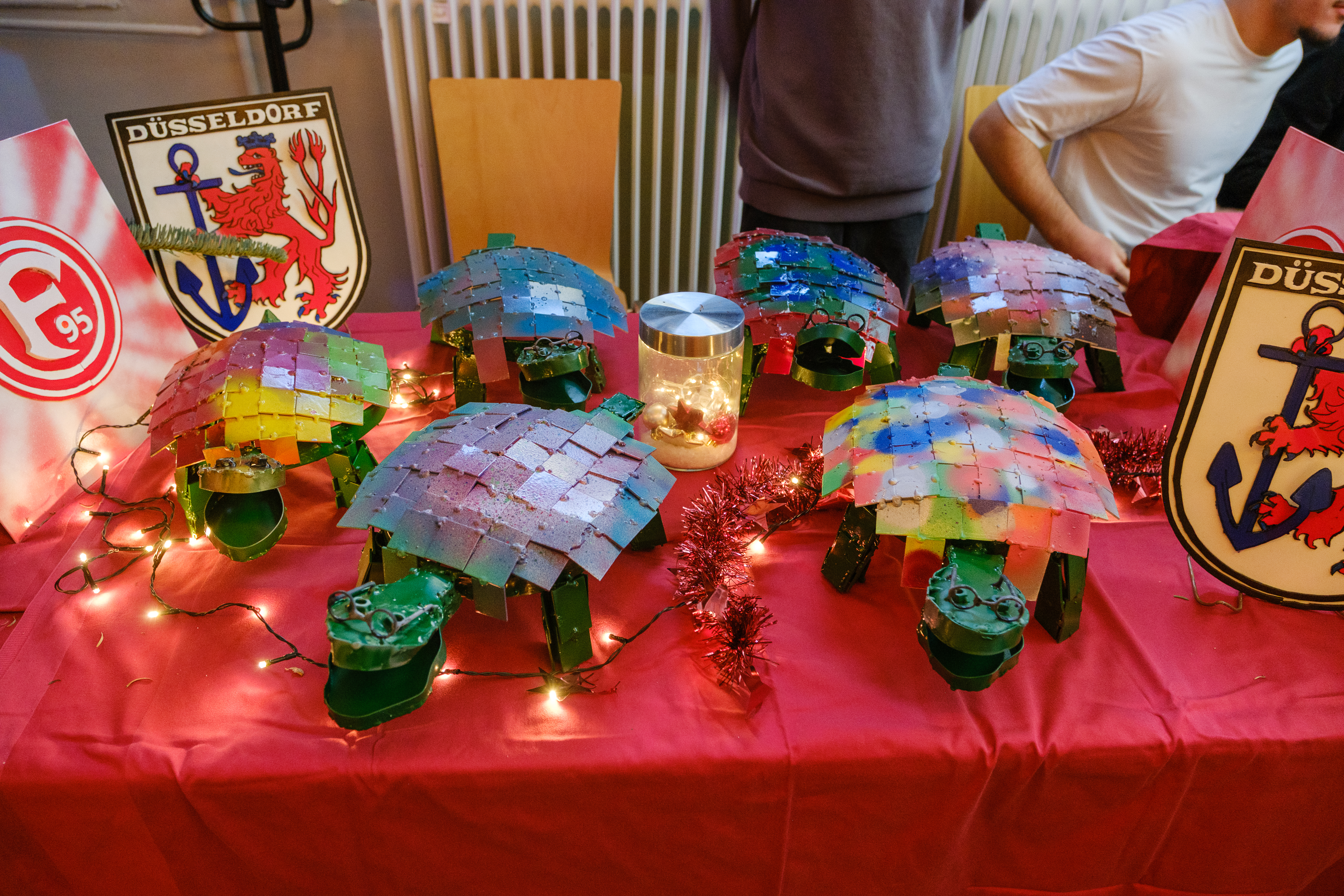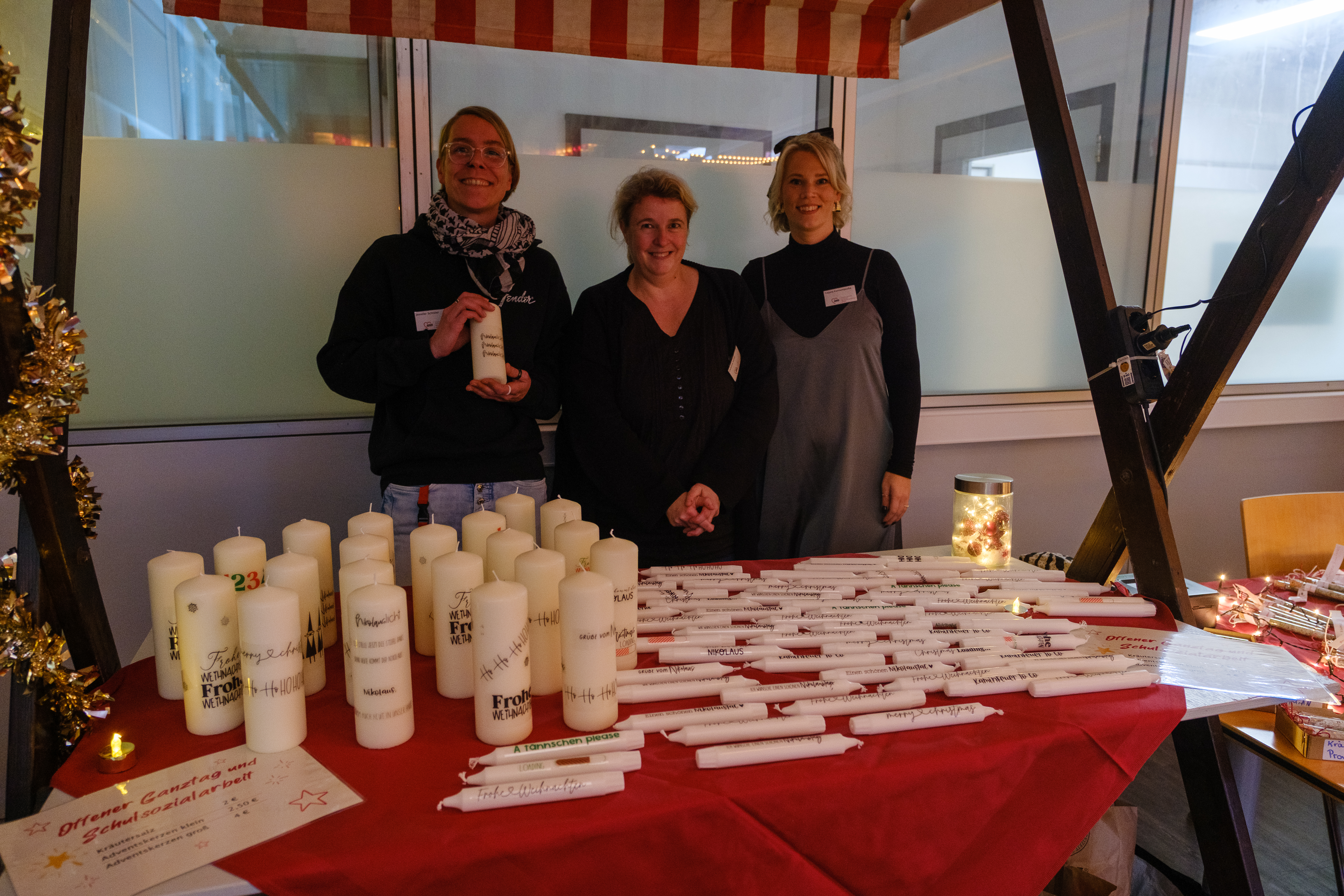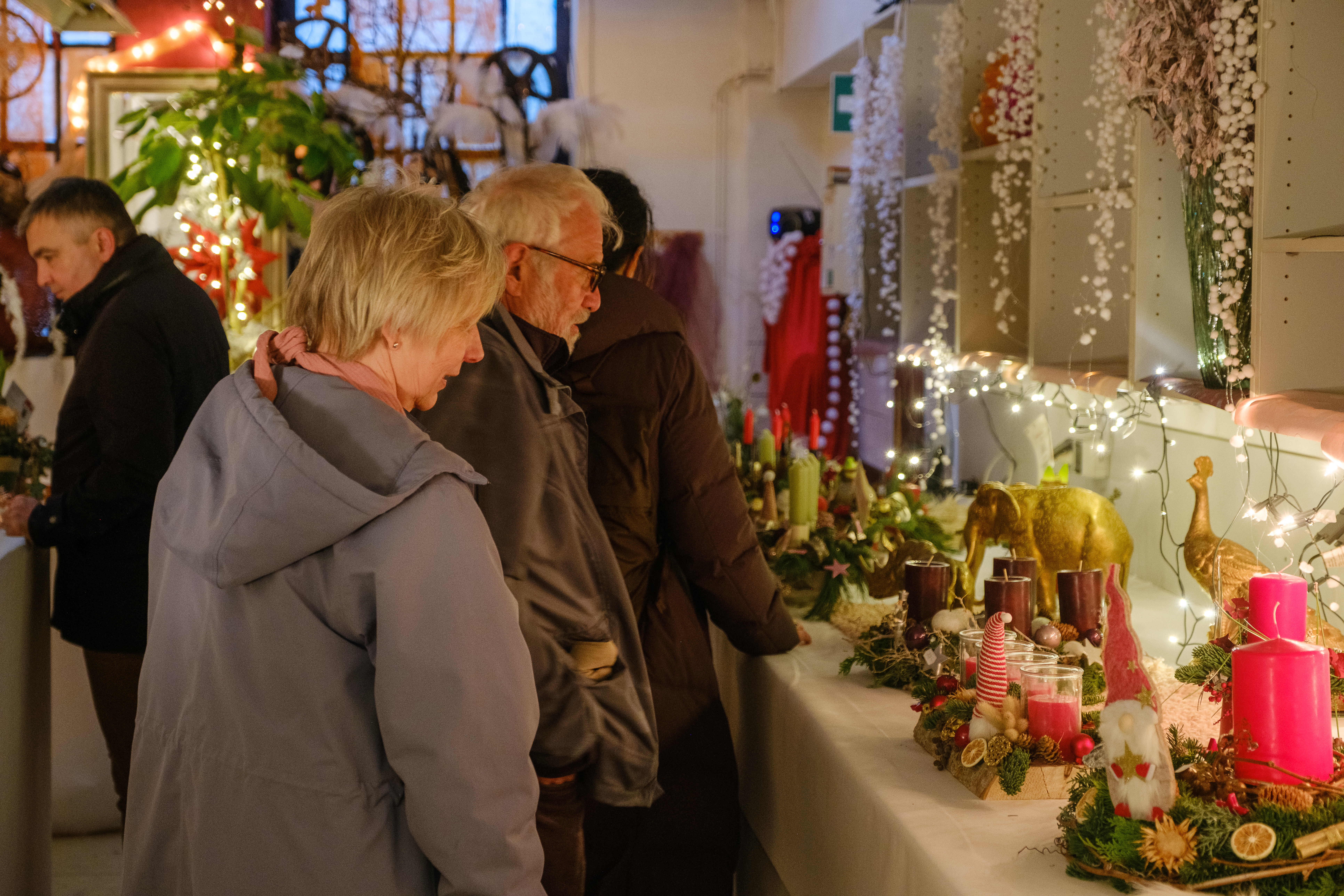 "Das BBZ leuchtet” - unter diesem Motto lud das AWO Berufsbildungszentrum (BBZ) am Donnerstag zum vorweihnachtlichen Beisammensein an den Flinger Broich ein. Auch in diesem Jahr gab es viele schöne und praktische Geschenkideen für das Weihnachtsfest. Dazu gehörten auch die beliebten Adventskränze - quasi ein Markenzeichen im BBZ-Jahresend-Angebot. Doch auch die Tigerenten, Metall-Schildkröten und viele andere von den Jugendlichen in Handarbeit gefertigte Produkte fanden ihre Käufer*innen. Für Schnappschüsse zum Mitnehmen stand die Fotobox bereit, und mit Süßem und Herzhaftem war auch für das leibliche Wohl gesorgt.