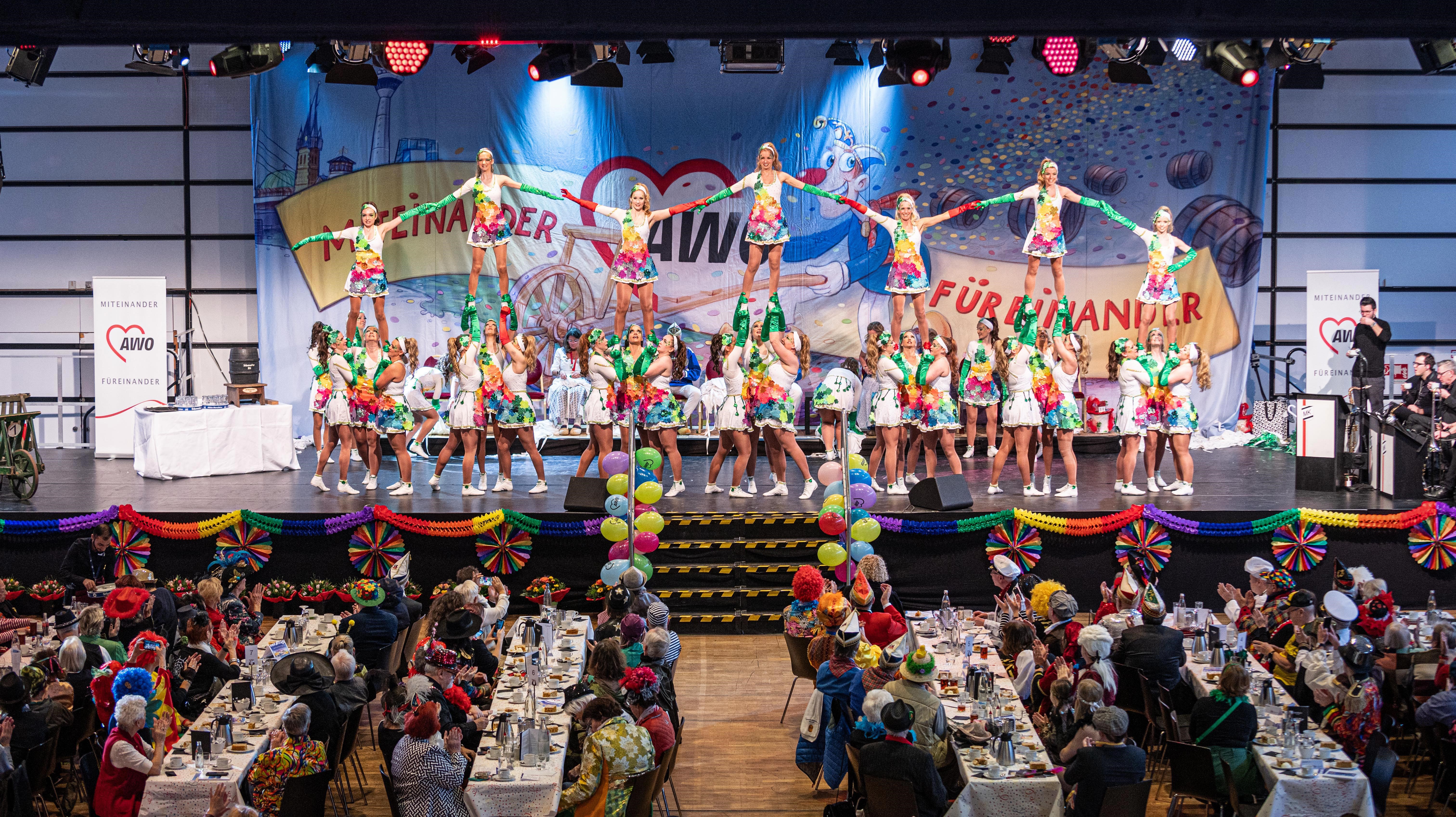 Den Auftakt machte diesmal die Tanzgarde der Karnevalsfreunde der katholischen Jugend. Binnen weniger Minuten stand der ganze Saal und sang und schunkelte mit. Christian Pape und Feuerwehrmann Kresse sorgten mit ihren pointierten Büttenreden ebenfalls für Begeisterung. Nach einem Jahr Unterbrechung stand die KG Regenbogen wieder beim AWO-Karneval auf der Bühne und überzeugte durch tänzerische und gesangliche Spitzenleistungen.