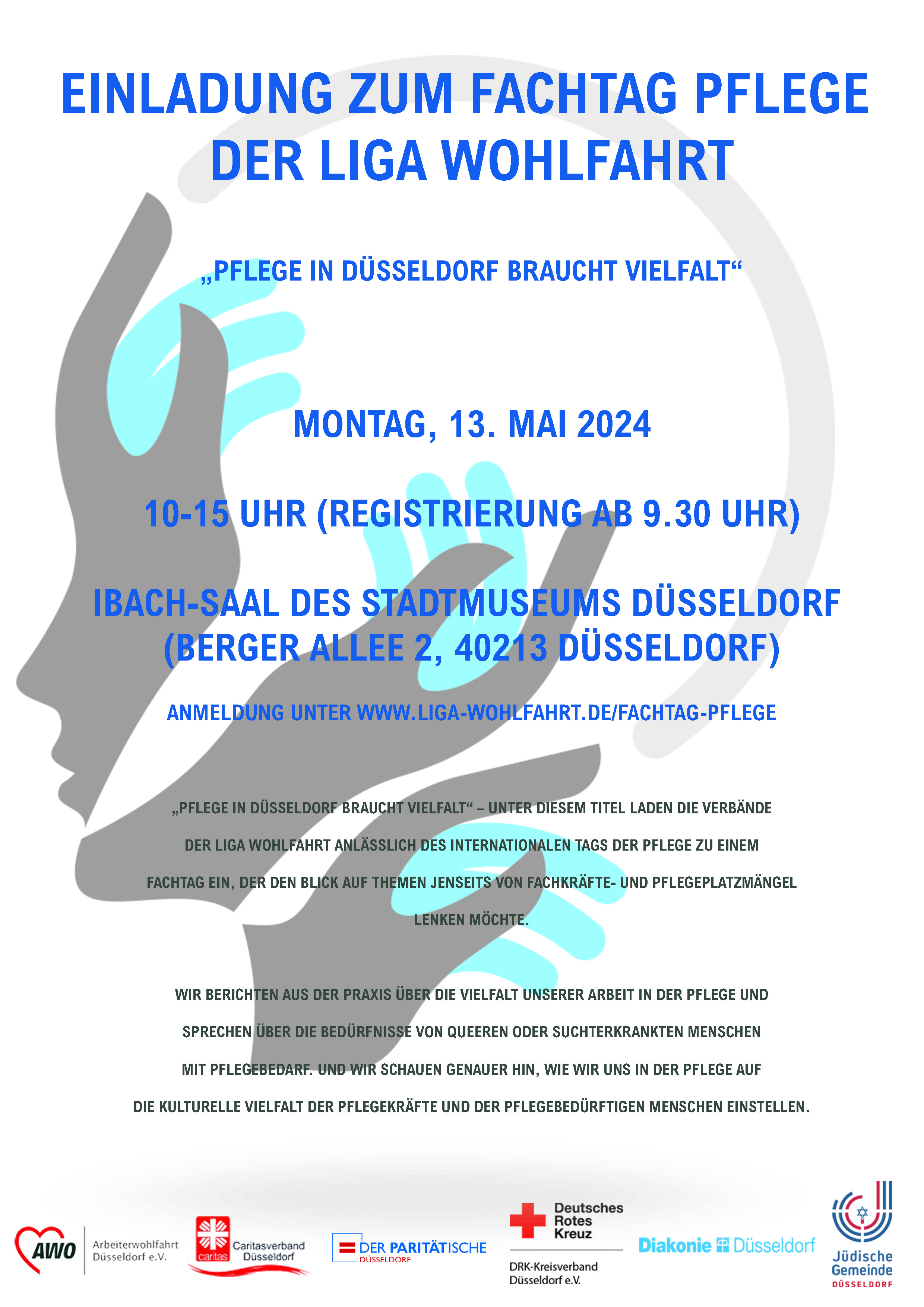 „Pflege in Düsseldorf braucht Vielfalt“ – unter diesem Titel laden die Verbände der Liga Wohlfahrt anlässlich des Internationalen Tags der Pflege zu einem Fachtag ein, der den Blick auf Themen jenseits von Fachkräfte- und Pflegeplatzmangel lenken möchte. Wir berichten aus der Praxis über die Vielfalt unserer Arbeit in der Pflege und sprechen über die Bedürfnisse von queeren oder suchterkrankten Menschen mit Pflegebedarf. Und wir schauen genauer hin, wie wir uns in der Pflege auf die kulturelle Vielfalt der Pflegekräfte und der pflegebedürftigen Menschen einstellen.