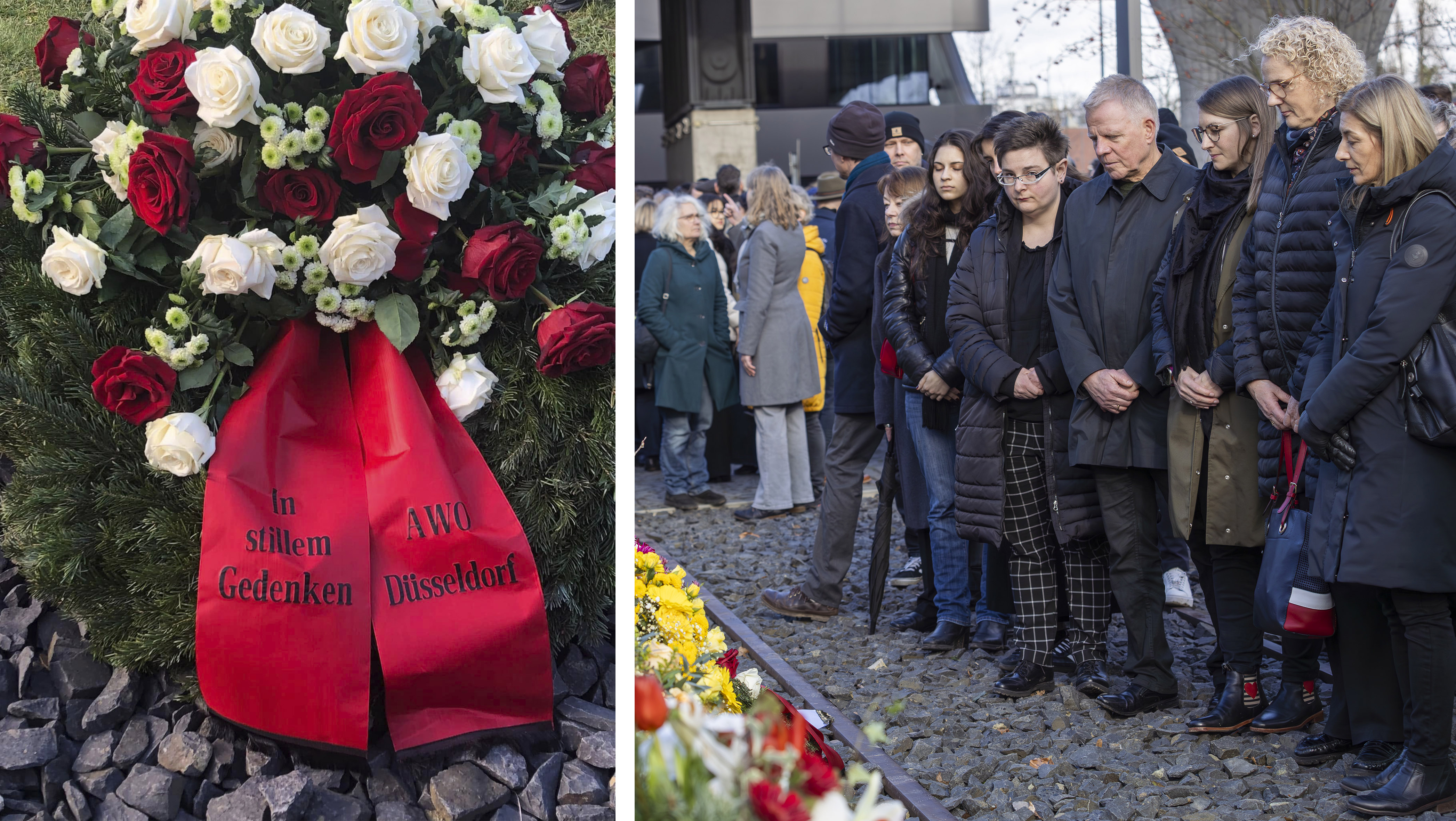 Die Befreiung des Vernichtungslagers Auschwitz jährte sich am 27. Januar 2025 zum 80. Mal. Anlässlich des internationalen Holocaust-Gedenktages hatte die Landeshauptstadt Düsseldorf an diesem Tag zu einer Kranzniederlegung am Mahnmal am ehemaligen Güterbahnhof im Stadtteil Derendorf eingeladen. Im Beisein von Marion Koebner, der Enkelin des in Auschwitz ermordeten Düsseldorfer Rabbiners Dr. Siegfried Klein, gedachten dort rund 350 Menschen der Opfer des Nationalsozialismus. AWO-Kreisgeschäftsführerin Marion Warden (Bild oben, 2. v. r.) und die Geschäftsführungen der Tochtergesellschaften Nuran Breuer, Johannes Dohms und Jennifer Metzlaff sowie weitere AWO-Mitarbeitende legten einen Kranz nieder.