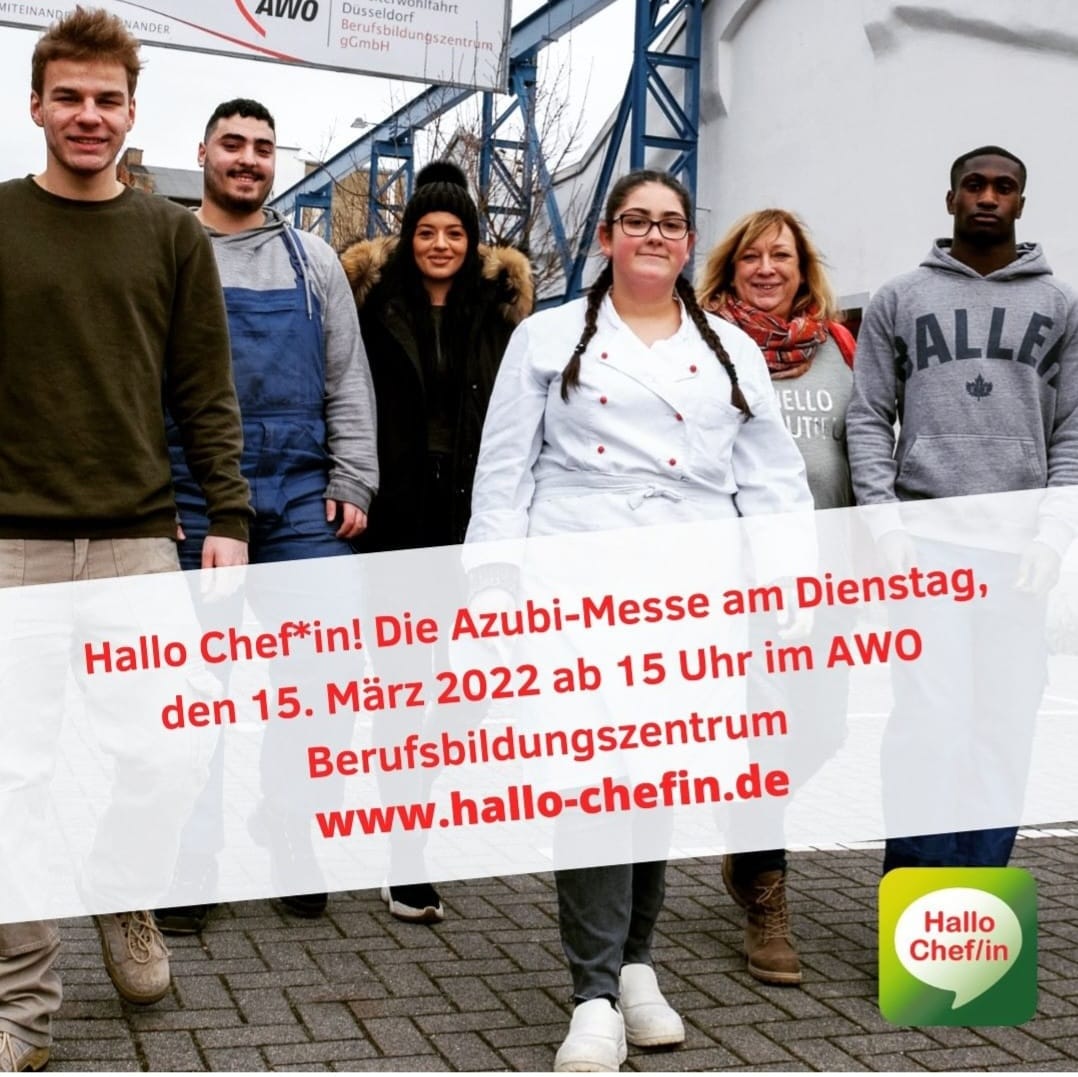 „Hallo Chef*in!" lautet das Motto der Azubi-Messe des AWO Berufsbildungszentrums (BBZ) und der KAUSA-Servicestelle Düsseldorf. Die Azubi-Messe findet am Dienstag, 15. März 2022, ab 15 Uhr im BBZ am Flinger Broich 12 statt. Schirmherr ist OB Dr. Stephan Keller.