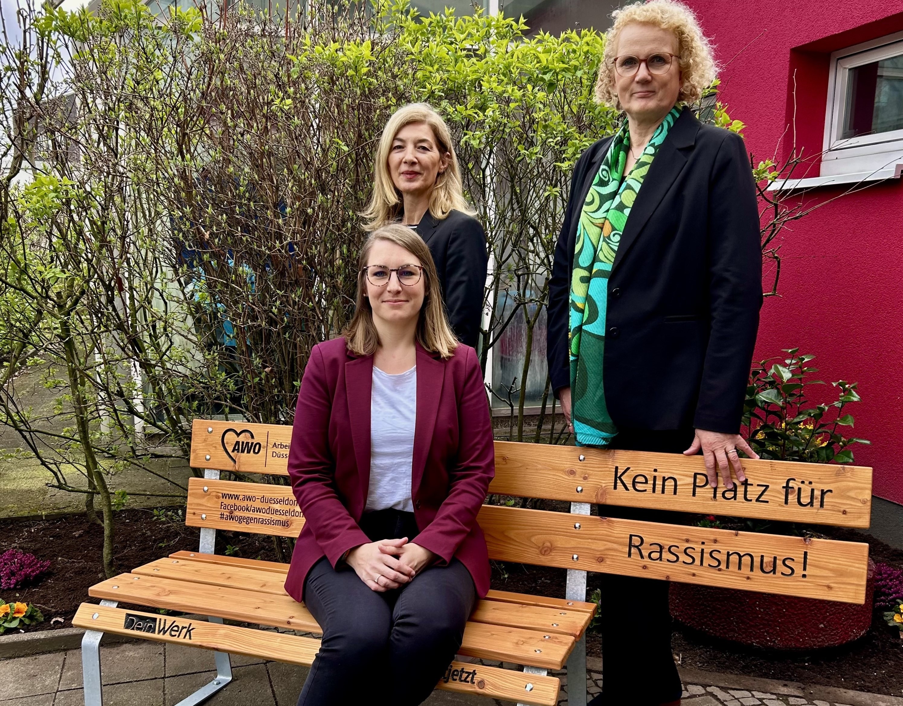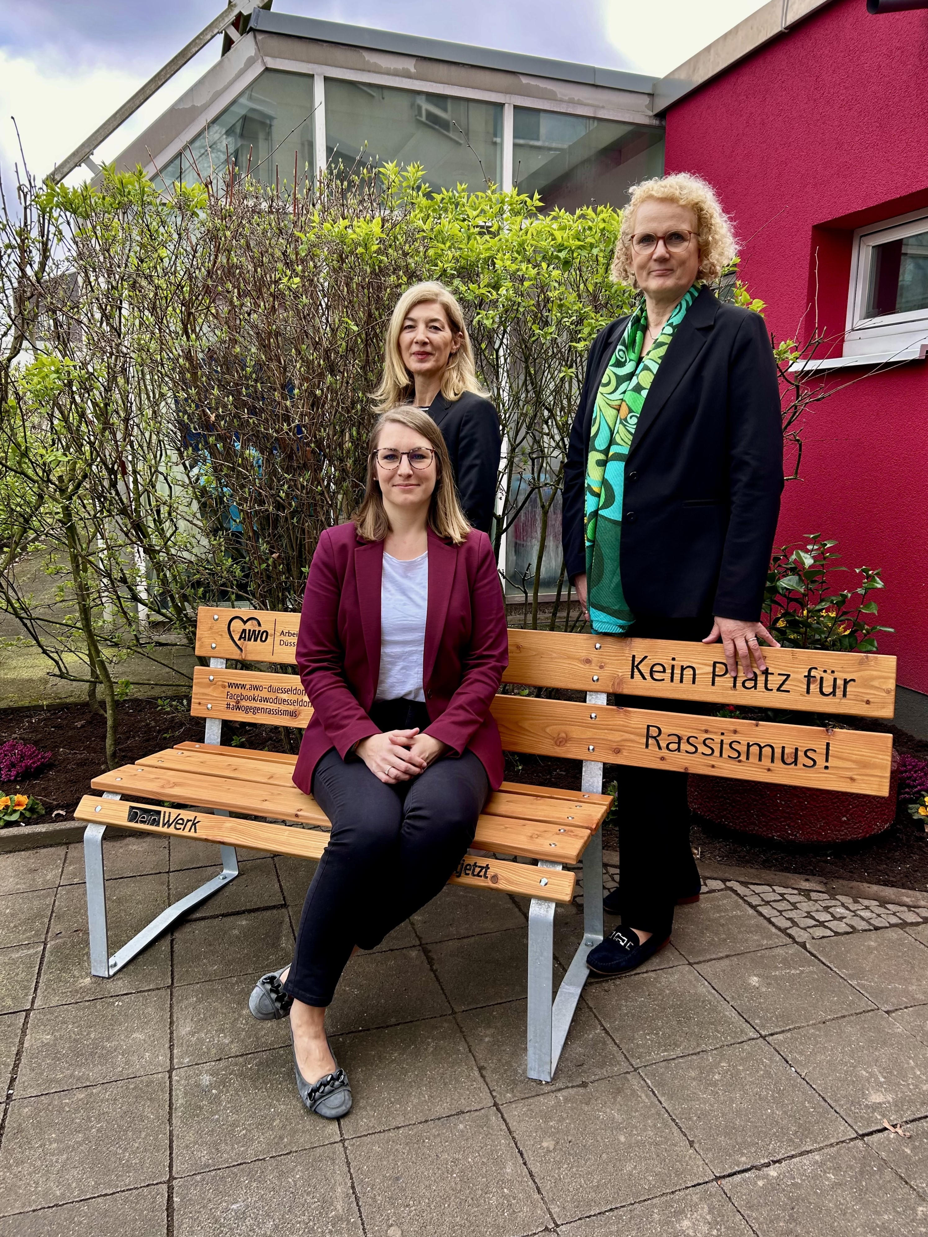 Gemeinsam mit Marion Warden weihten Jennifer Metzlaff (Geschäftsführerin AWO VITA gGmbH) und Nuran Breuer (Geschäftsführerin AWO Familienglobus gGmbH) die Bank ein: „Mit dieser Bank wollen wir Intoleranz entgegenwirken und den momentan aufkeimenden Rassismus und Antisemitismus öffentlichkeitswirksam thematisieren. Denn: Nie wieder ist jetzt“, so Breuer.