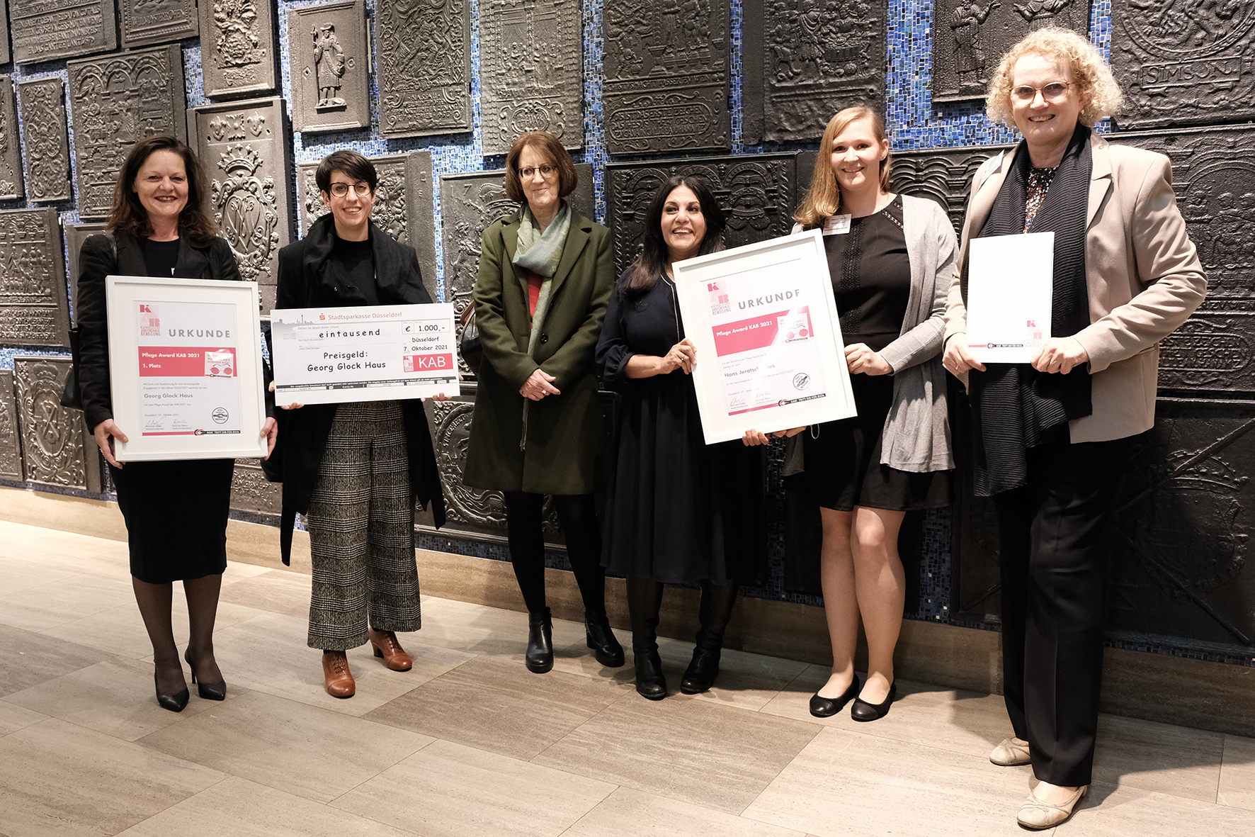 (kws) Große Auszeichnung für das Georg-Glock-Haus der AWO VITA gGmbH. Die stationäre Pflegeeinrichtung der AWO Düsseldorf im Stadtteil Lierenfeld hat den 1. Preis beim Pflege Award der Katholischen Arbeitnehmerbewegung (KAB) gewonnen. Die in diesem Jahr erstmals ausgelobte Auszeichnung wurde am Welttag der menschenwürdigen Arbeit im Beisein von Schirmherr Oberbürgermeister Dr. Stephan Keller im Düsseldorfer Rathaus an Kerstin Böber übergeben. Die Pflegedienst- und stellvertretende Einrichtungsleiterin nutzte die freudige Gelegenheit, um sich vor allem bei Ihrem Team zu bedanken: „Ohne die tatkräftige Unterstützung aller Beschäftigten und deren unermüdlichen Einsatz wäre ein solches Projekt nicht machbar gewesen und darauf bin ich persönlich sehr stolz.“