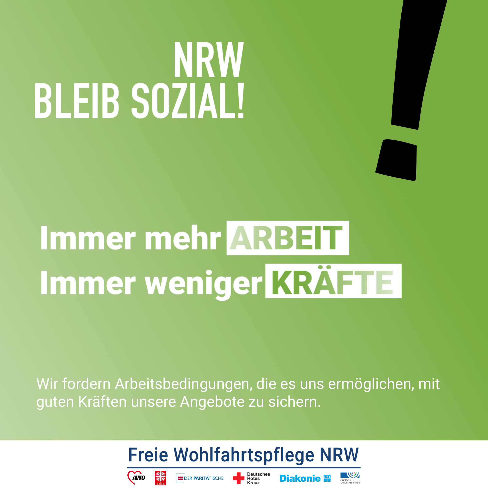 Unterfinanzierung, Fachkräftemangel, überbordende Bürokratie, Versorgungslücken und vieles mehr - wir müssen weiter lautstark auf die unerträglichen Missstände im sozialen Bereich aufmerksam machen! Hierfür benötigen wir auch Ihre Stimme: NRW bleib sozial - Unterstützung | Freie Wohlfahrtspflege NRW (freiewohlfahrtspflege-nrw.de)