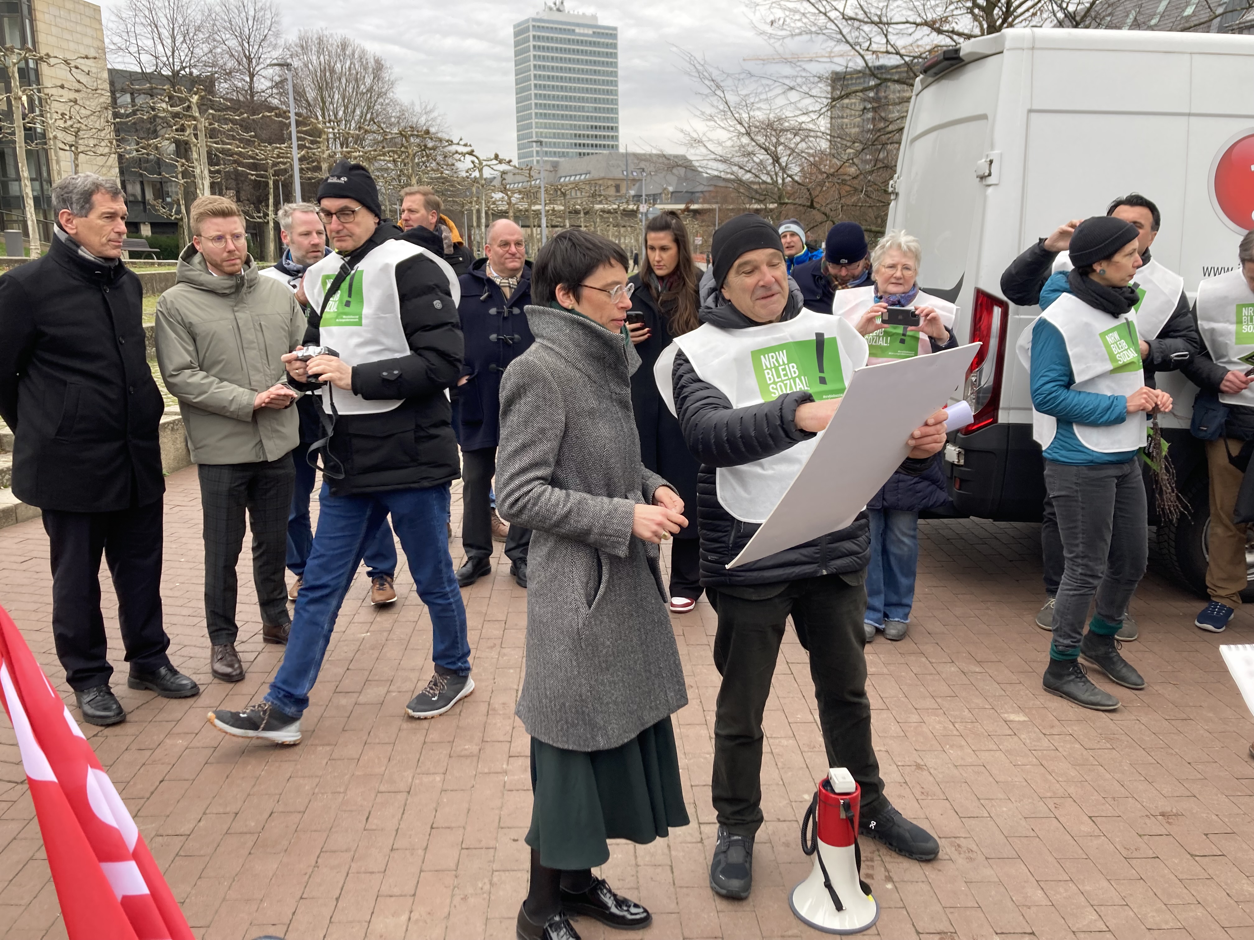 Über 70 Vertreter*innen der Freien Wohlfahrtspflege NRW, darunter auch die AWO Düsseldorf, setzten am 5. Dezember ein weiteres Zeichen für eine starke soziale Infrastruktur in Nordrhein-Westfalen. Nachdem die Freie Wohlfahrtspflege NRW bereits im September und Oktober vor dem Landtag im Rahmen einer Mahnwache gegen die Kürzungspläne der Landesregierung demonstrierten und am 13. November sogar über 32.000 Menschen auf den Rheinwiesen dagegen protestierten, setzte die Freie Wohlfahrtspflege damit kurz vor der finalen Entscheidung über den Landtagshaushalt ihre Proteste fort.