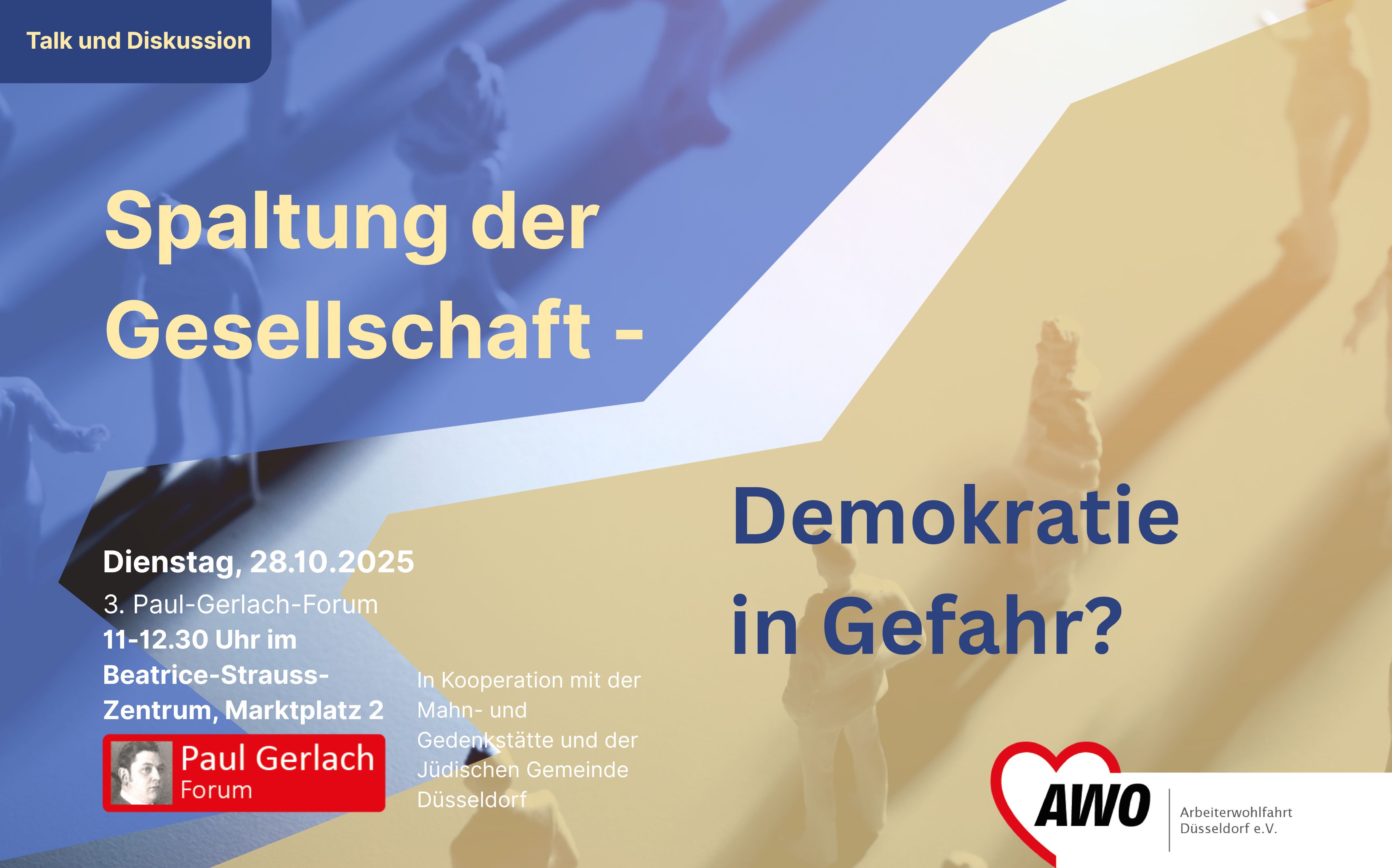Mit dem Paul-Gerlach-Forum erinnert die AWO Düsseldorf an ihren Mitbegründer Paul Gerlach, der 1944 als Opfer des Nationalsozialismus starb. Die jährliche Veranstaltung in Kooperation mit der Mahn- und Gedenkstätte und der Jüdischen Gemeinde Düsseldorf ist als Forum der politischen Bildung konzipiert und beleuchtet aktuelle gesellschaftliche Entwicklungen.