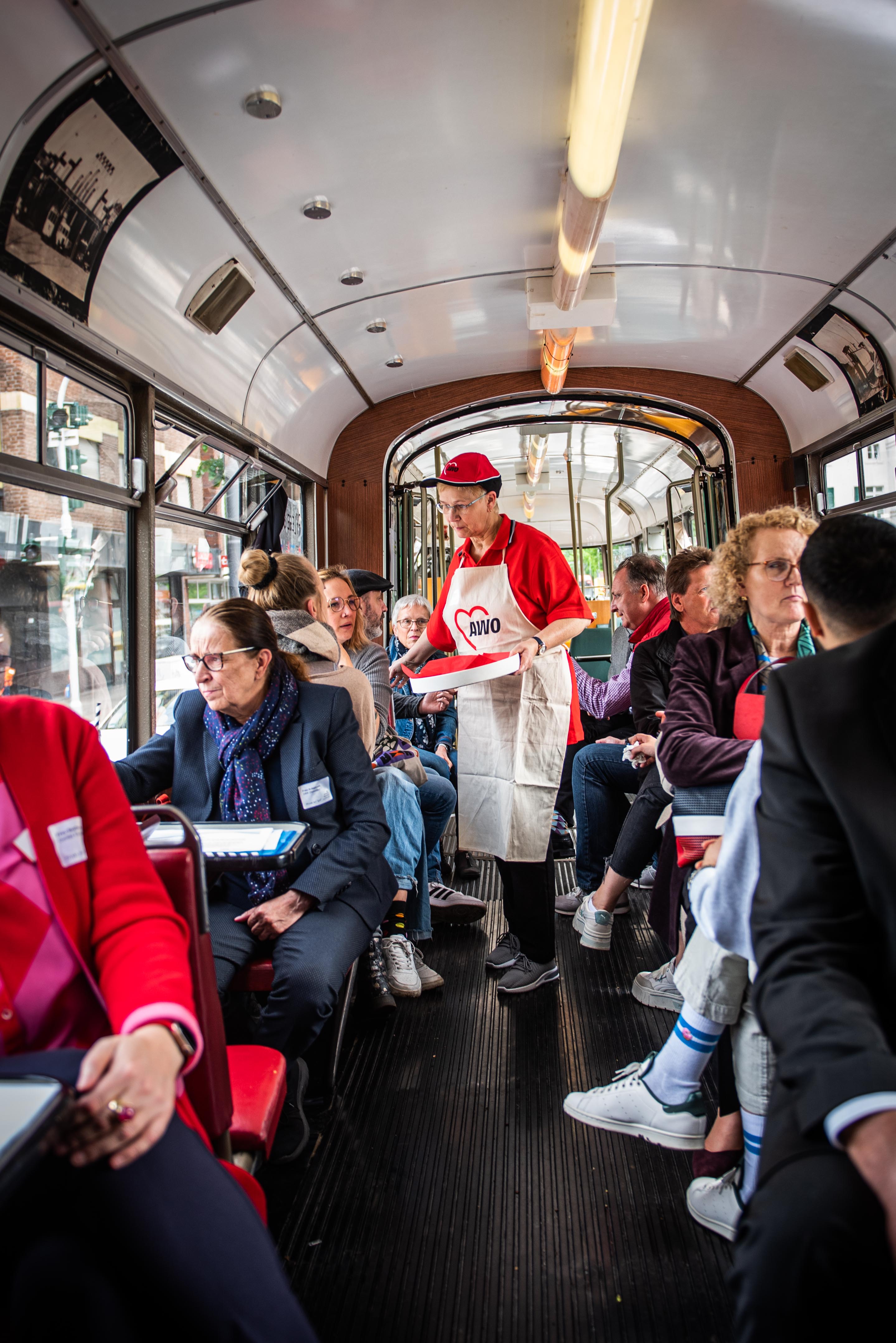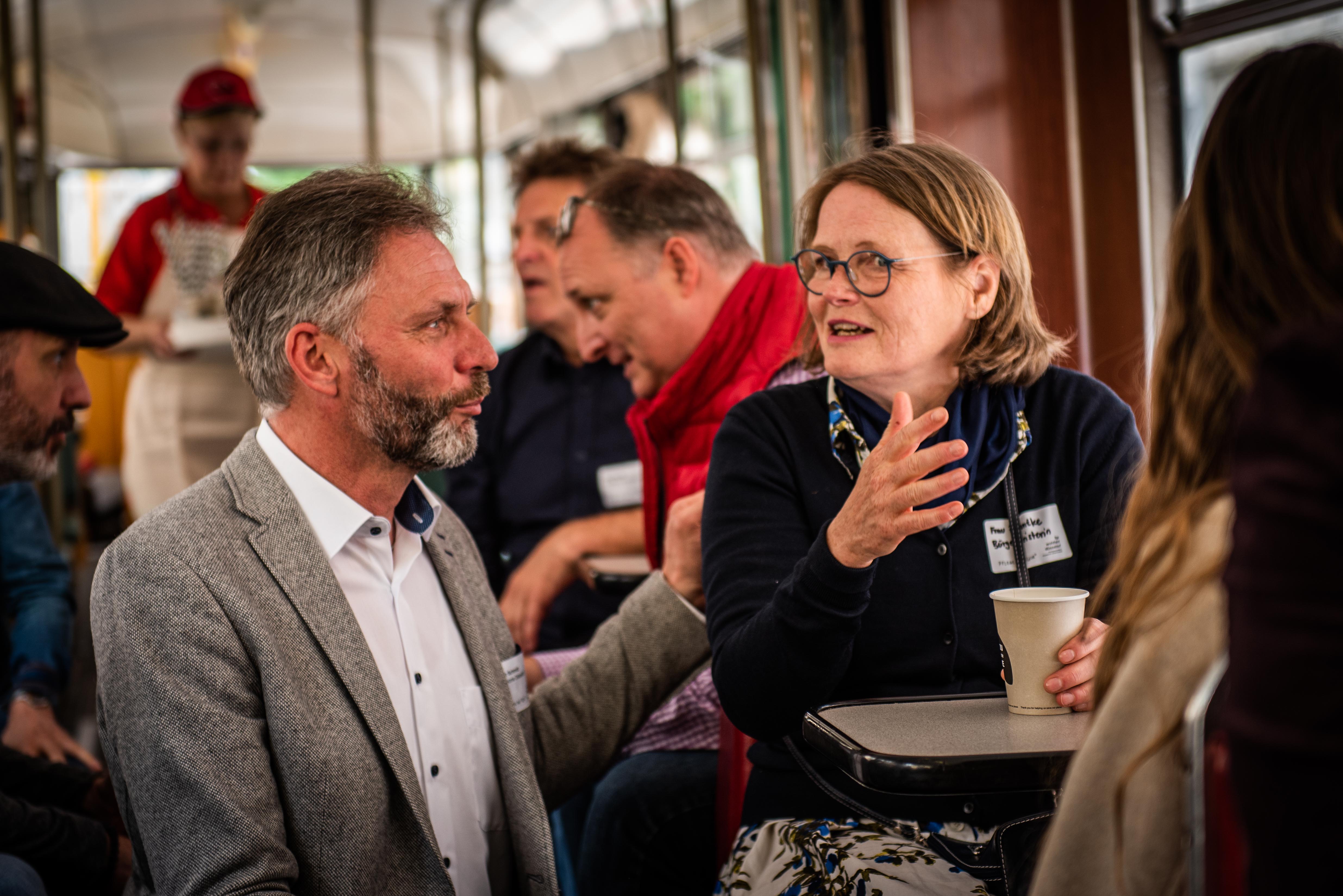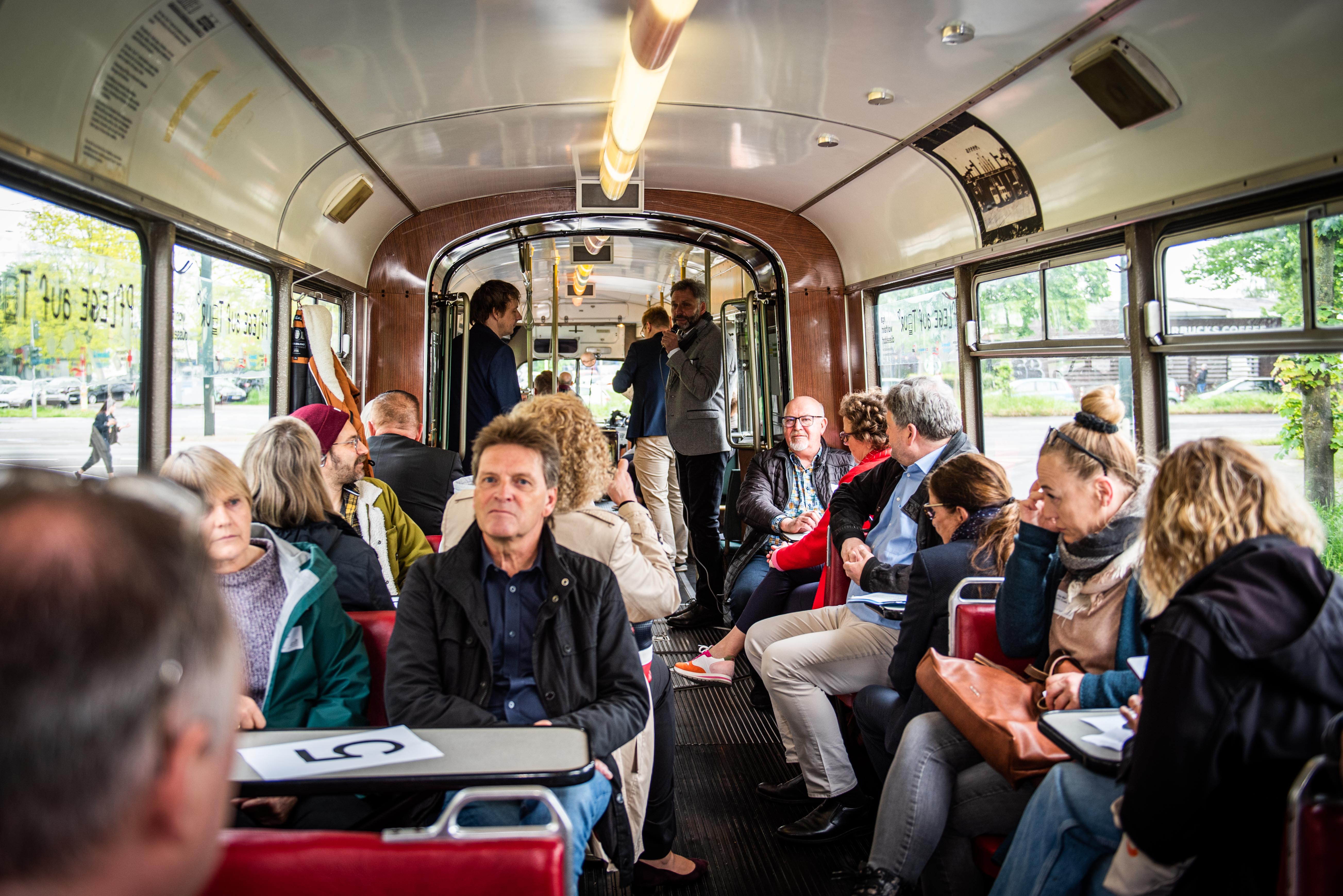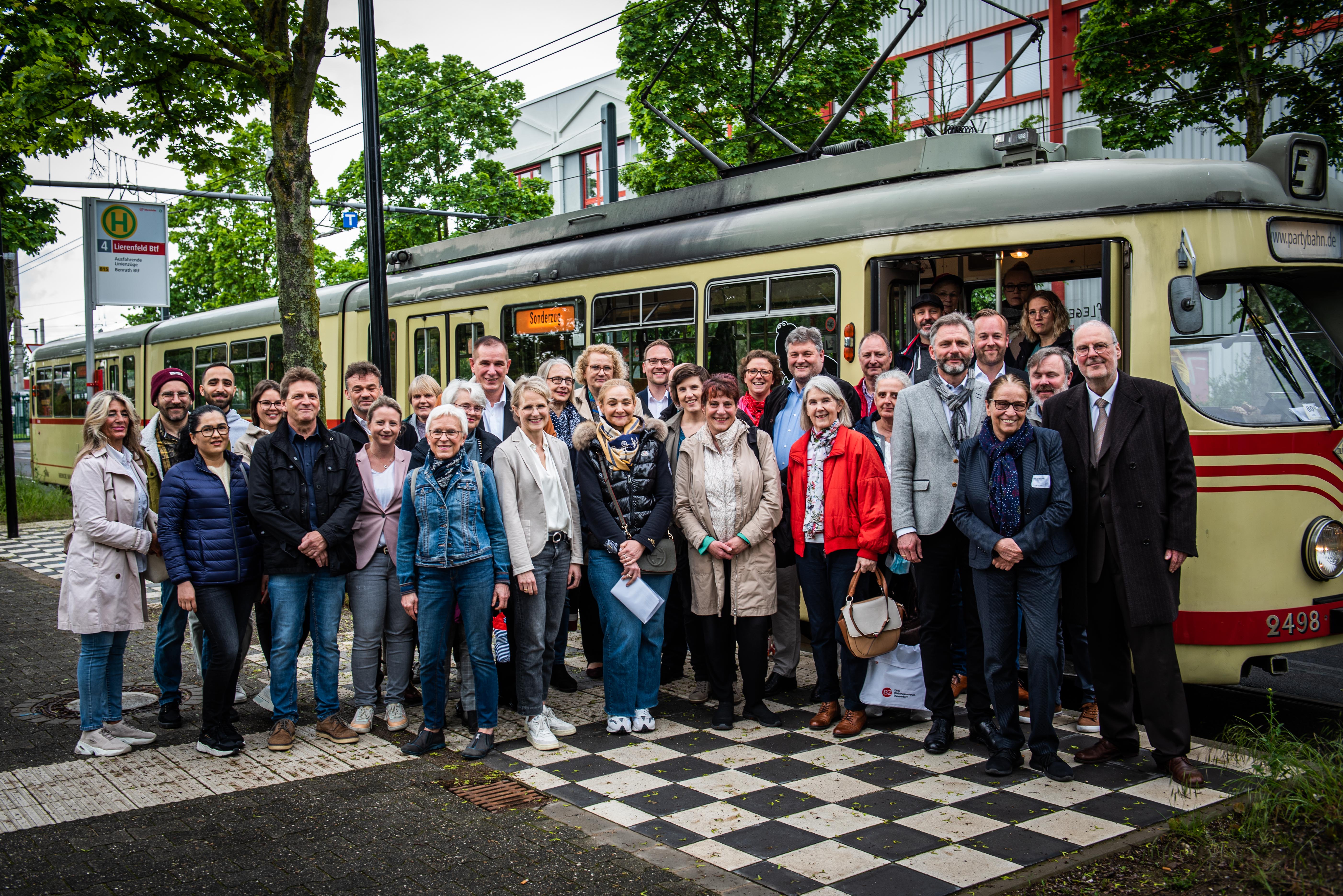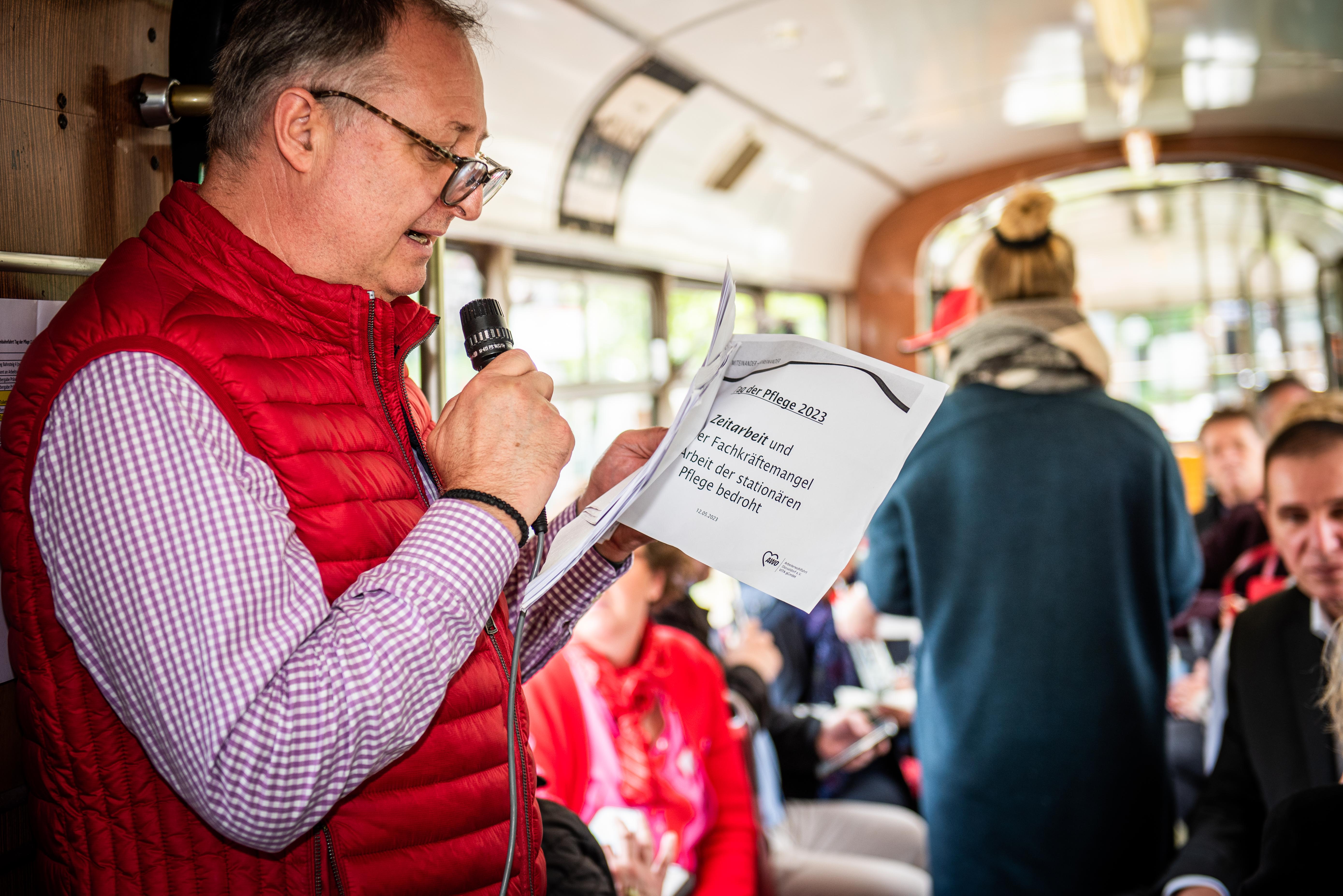 Über Pflege wird viel gesprochen, aber nur selten wird sie nach außen sichtbar. Das möchte die Düsseldorfer Liga Wohlfahrt ändern und hatte zum Tag der Pflege am 12. Mai Fachleute aus unterschiedlichsten Bereichen der Pflege - vom Azubi bis zur Ausbildungsleiterin - zu einer Rundfahrt in einer historischen Straßenbahn durch die Stadt eingeladen.