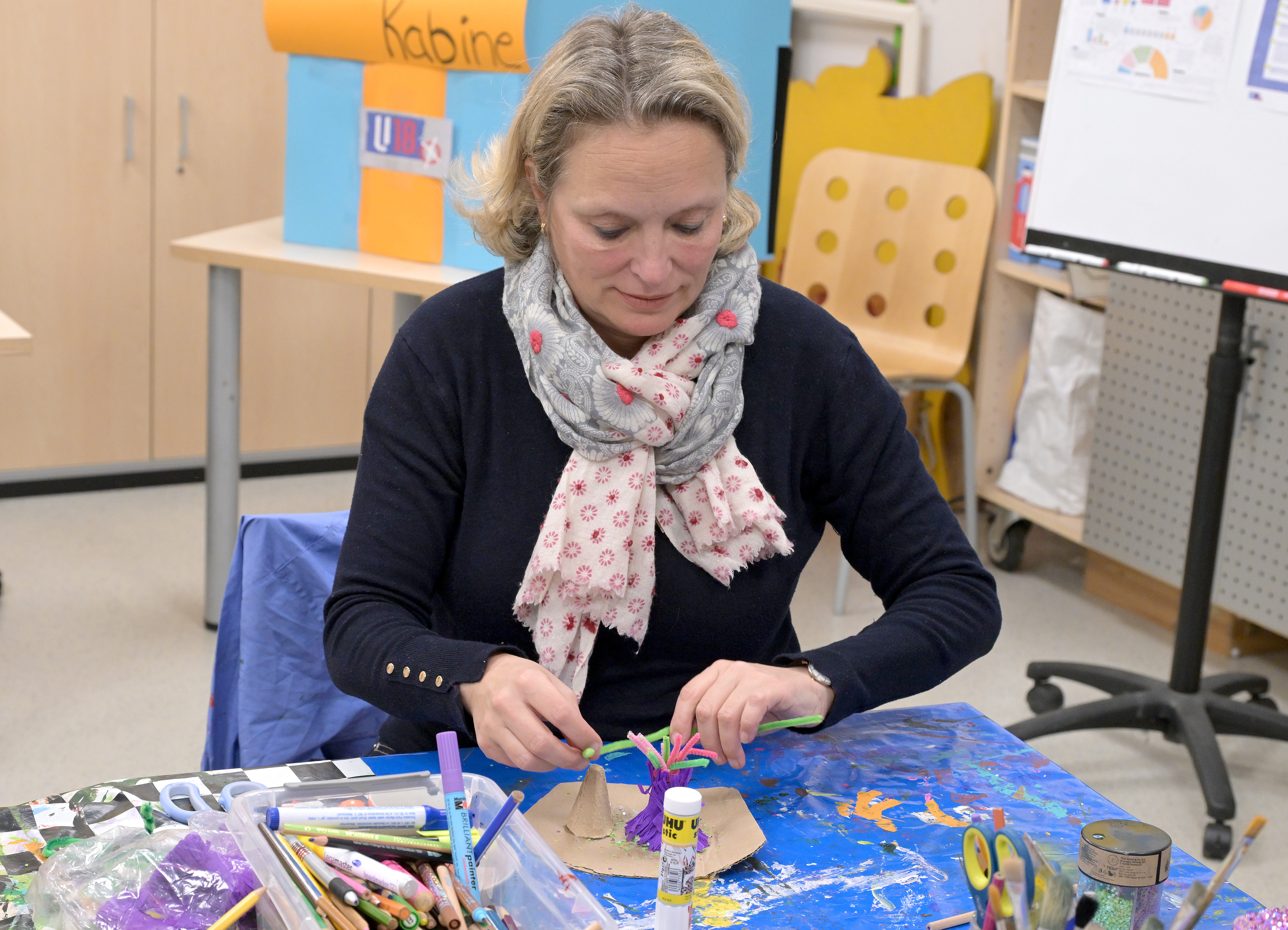 Dr. Christine Rachner sprang für die Bundestagskandidat*innen der FDP, Moritz Kracht und Lida Azarnoosh, ein und unterstützte das Kreativ- und Bastelangebot. Gemeinsam mit einigen Jugendlichen gestaltete sie Masken aus verschiedenen Materialien.