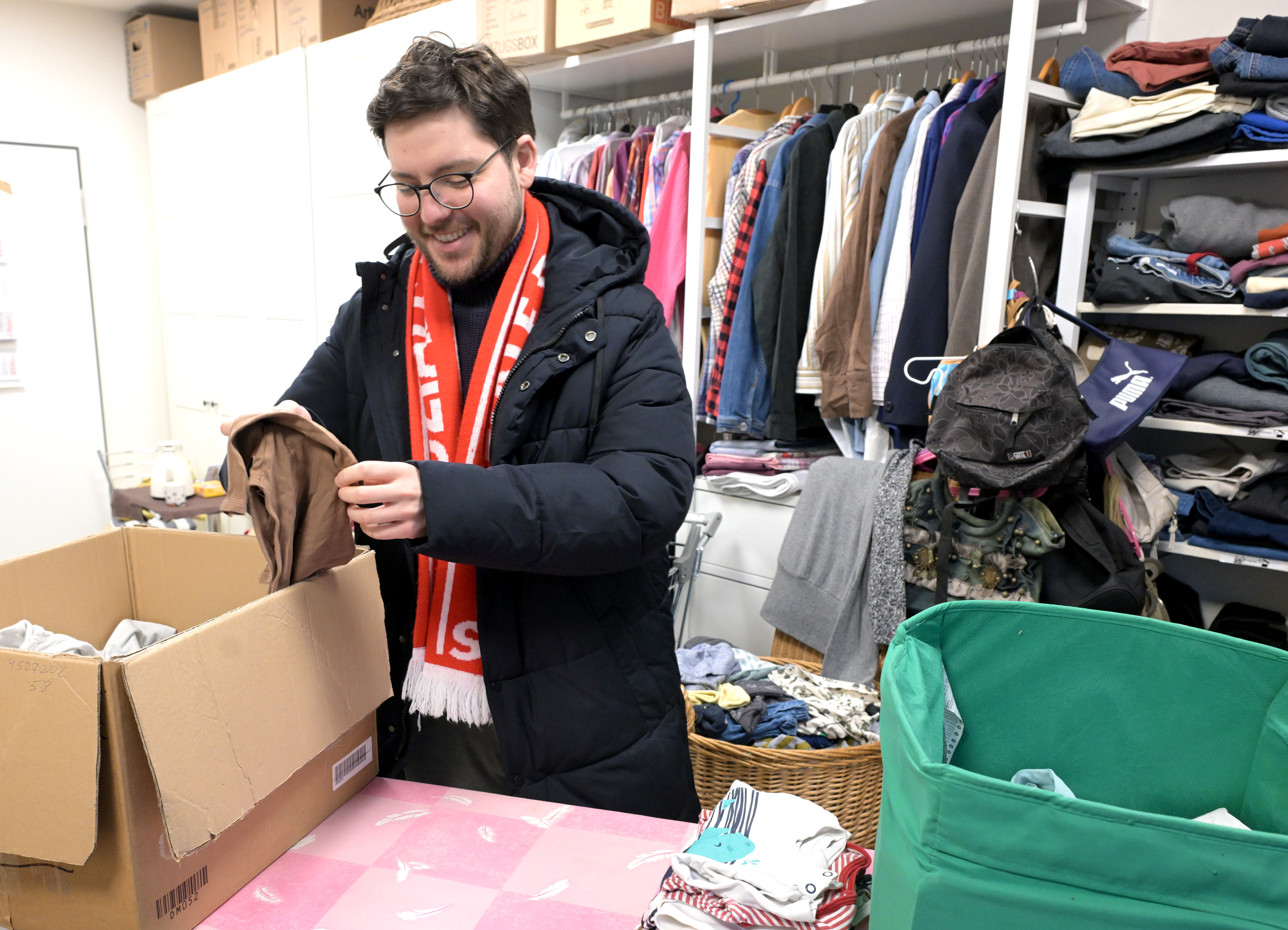 Nach dem Gespräch folgte der praktische Teil des Ehrenamts-Praxis-Checks. Adis Selimi packte im Kleiderladen des Aktiv- und Stadtteiltreffs mit an. Der Laden, wie viele andere Projekte im Treff, wird von ehrenamtlichen Helfer*innen betrieben. Passend zum Zeitpunkt seines Besuchs traf gerade eine große Spende mit Babykleidung ein, die er umgehend beim Sortieren unterstützte.