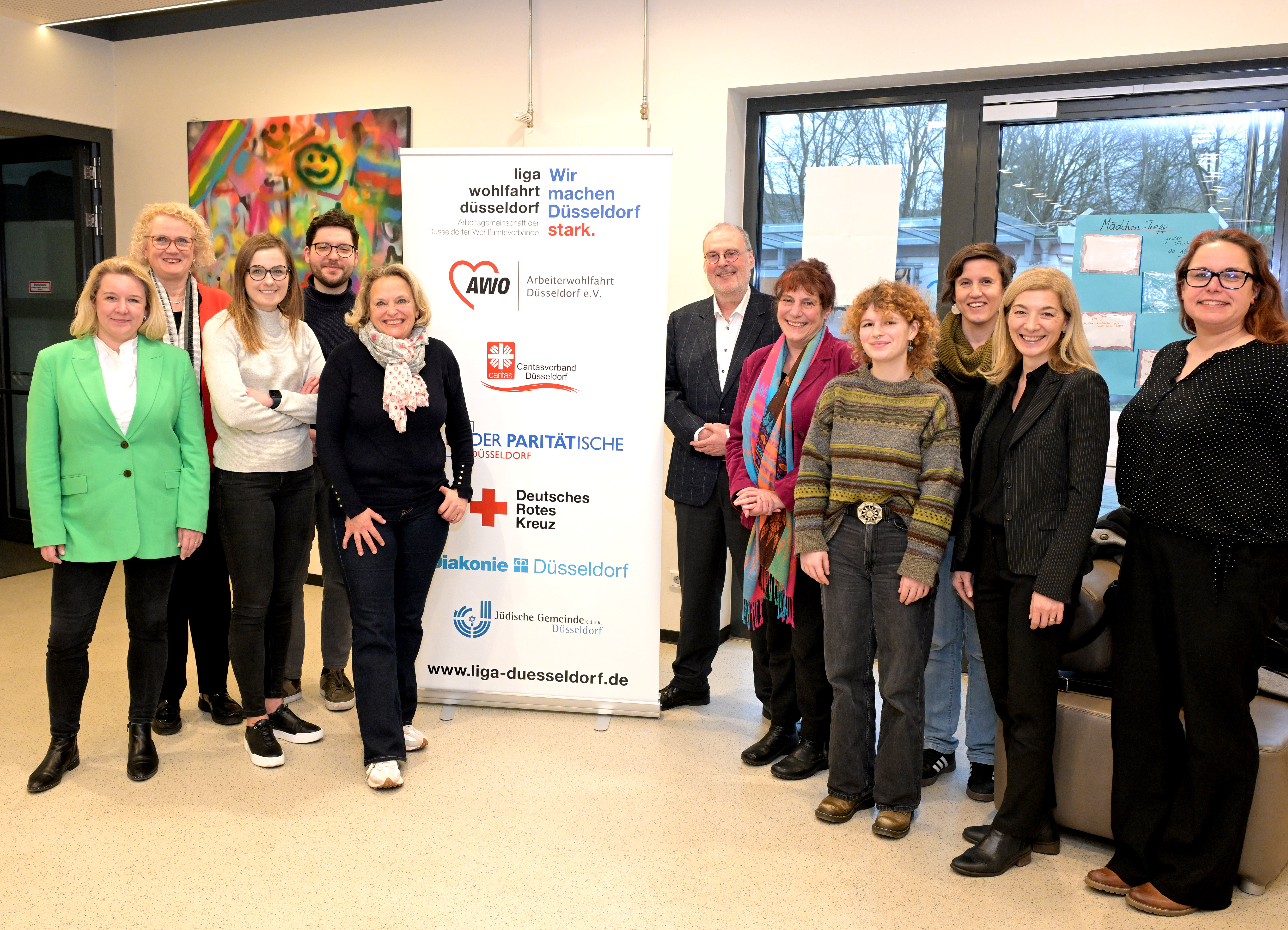 Bevor sich Adis Selimi und Zanda Martens MdB (beide SPD), Lisa Schubert (Die Linke) sowie Ratsfrau Dr. Christine Rachner (FDP) verschiedenen Aufgaben in unterschiedlichen Tätigkeitsfeldern des Aktiv- und Stadtteiltreffs stellten, tauschten sie sich mit Vertreter*innen der liga wohlfahrt Düsseldorf aus. In der Gesprächsrunde wurden zentrale Herausforderungen der sozialen Arbeit diskutiert, darunter der akute Fachkräftemangel in Betreuung und Pflege, die schwierige Situation mit Leiharbeiter*innen sowie die zunehmende bürokratische Belastung.