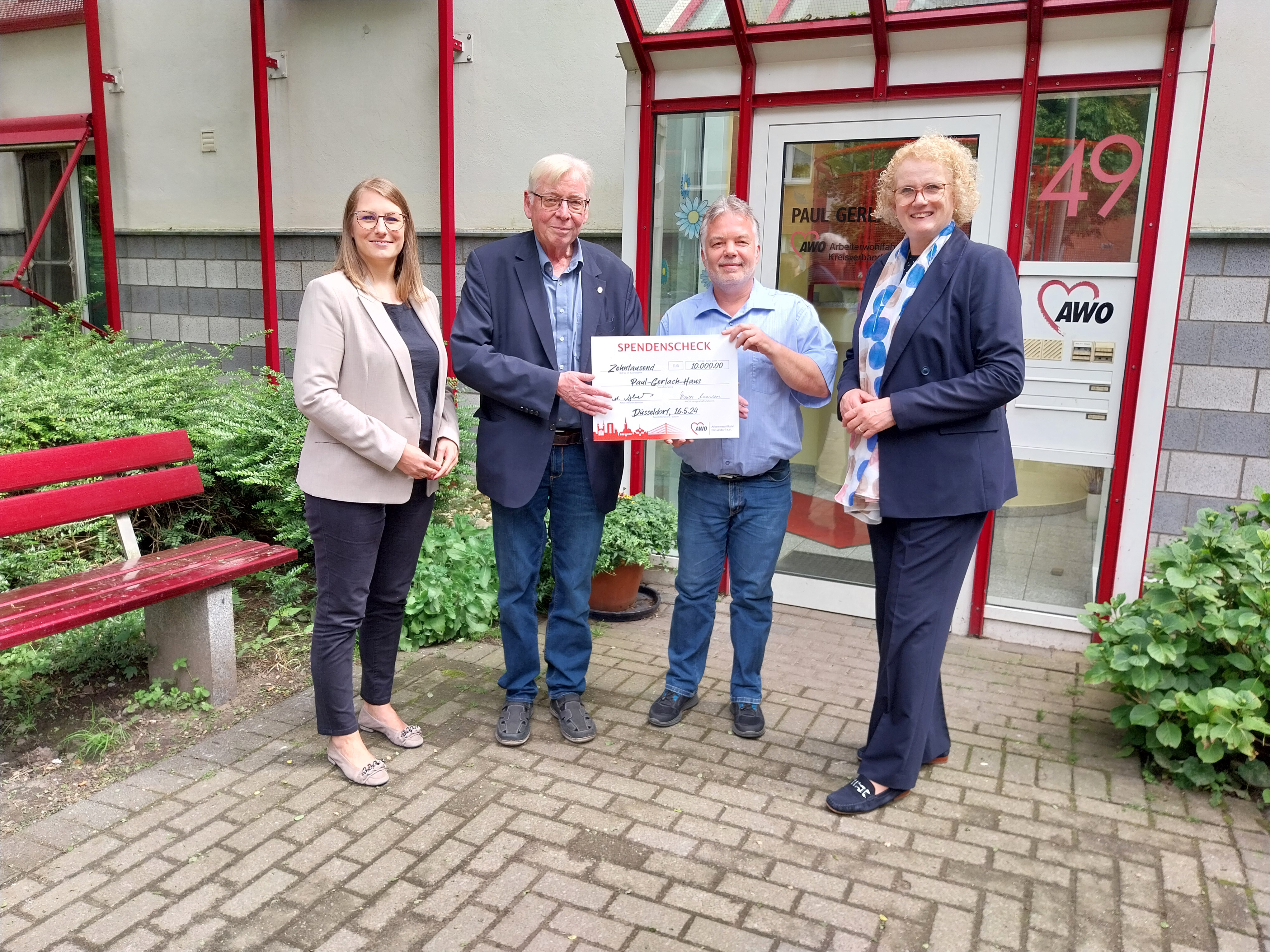 Jennifer Metzlaff, Geschäftsführerin der AWO VITA gGmbH, und Einrichtungsleiter Norbert Roß nahmen am Donnerstag, 16. Mai 2024, die Spende entgegen. Überreicht wurde sie von dem Kreisvorsitzenden Manfred Abels und AWO-Kreisgeschäftsführerin Marion Warden. Das Geld wird in verschiedenen Bereichen der Freizeitgestaltung eingesetzt, wo genau, das haben die Bewohner*innen selbst entschieden: Ein Teil soll in gemeinsame Reisen und Freizeitausflüge fließen, die Jüngeren wünschen sich eine neue Spielekonsole, eine andere Gruppe ein Sportgerät und der Gemeinschaftsraum soll zusammen verschönert werden.