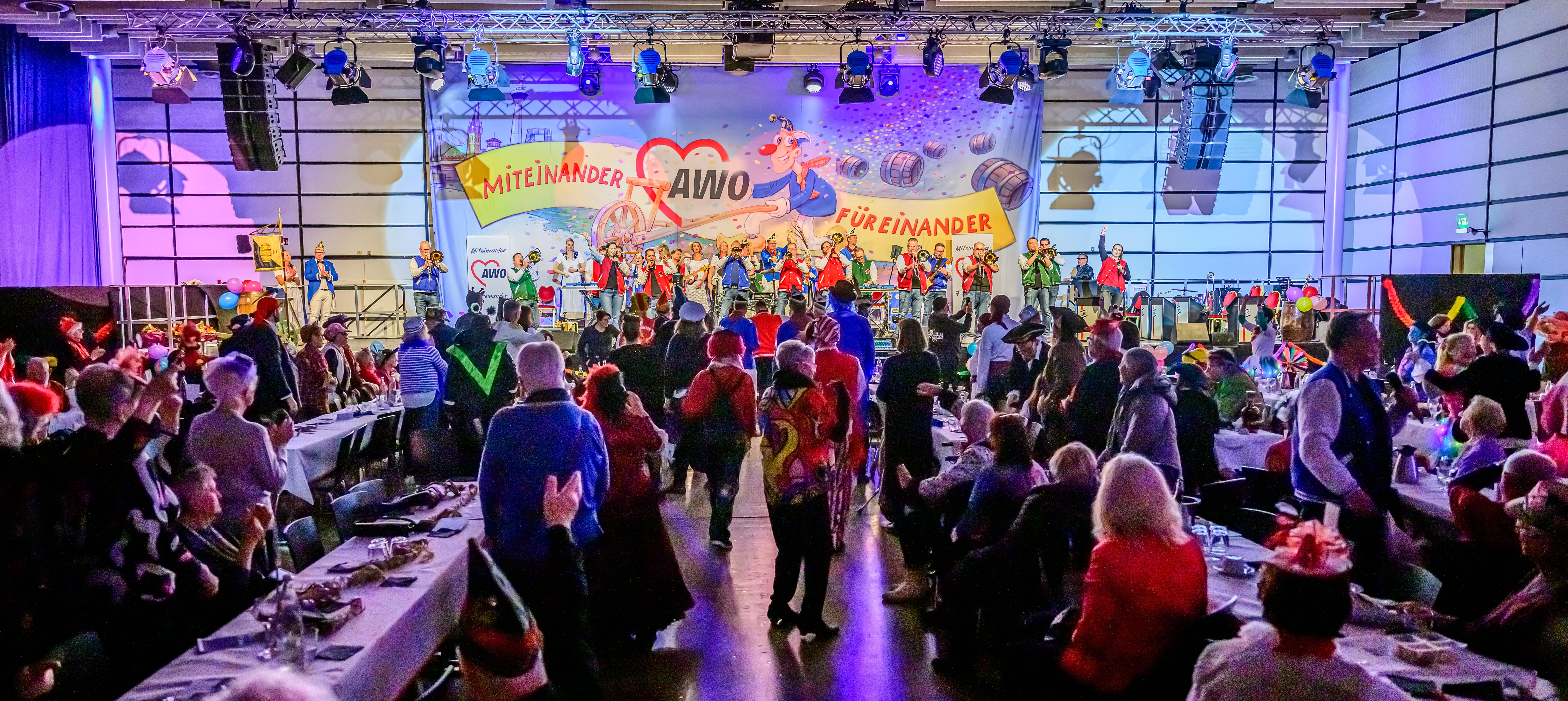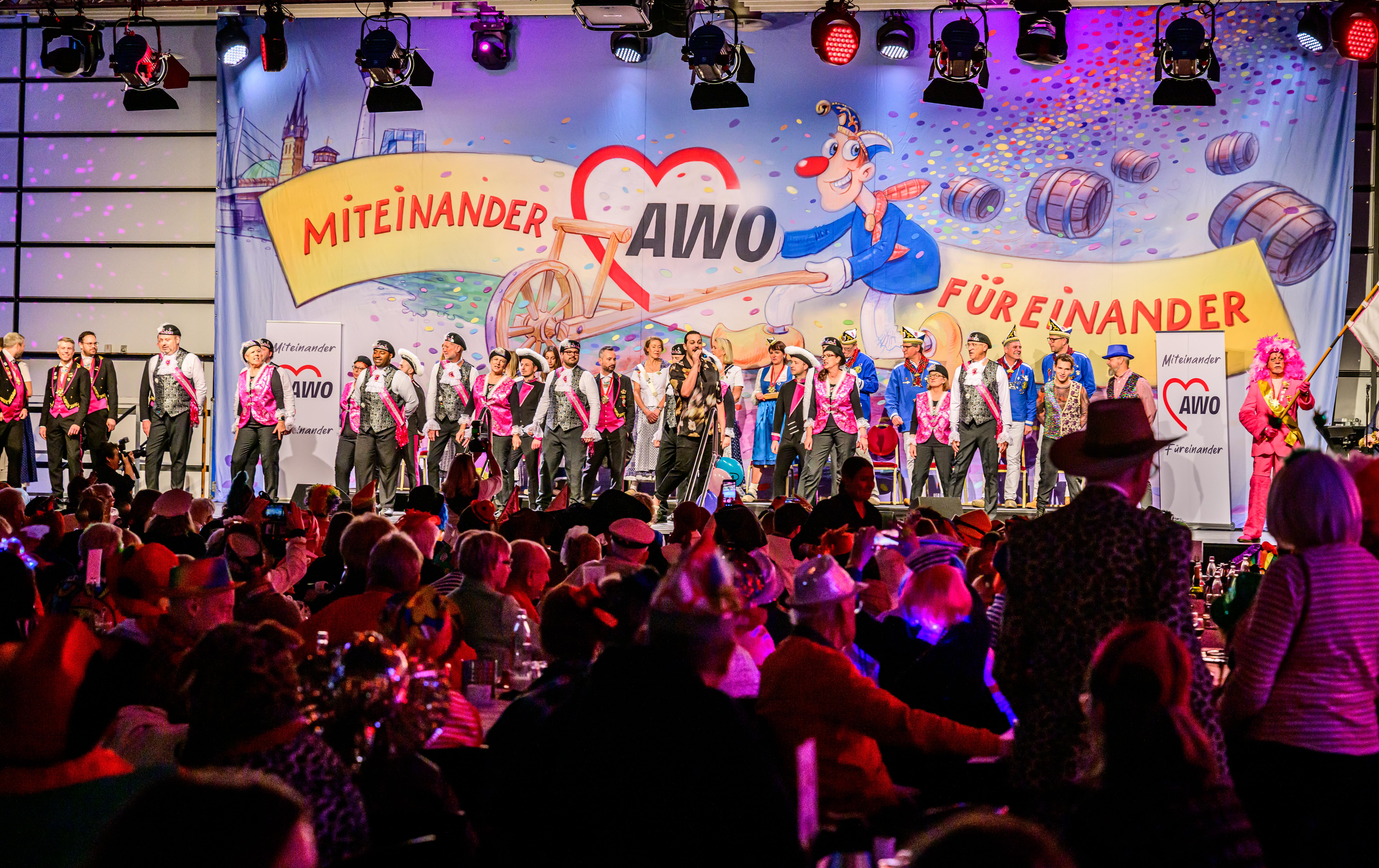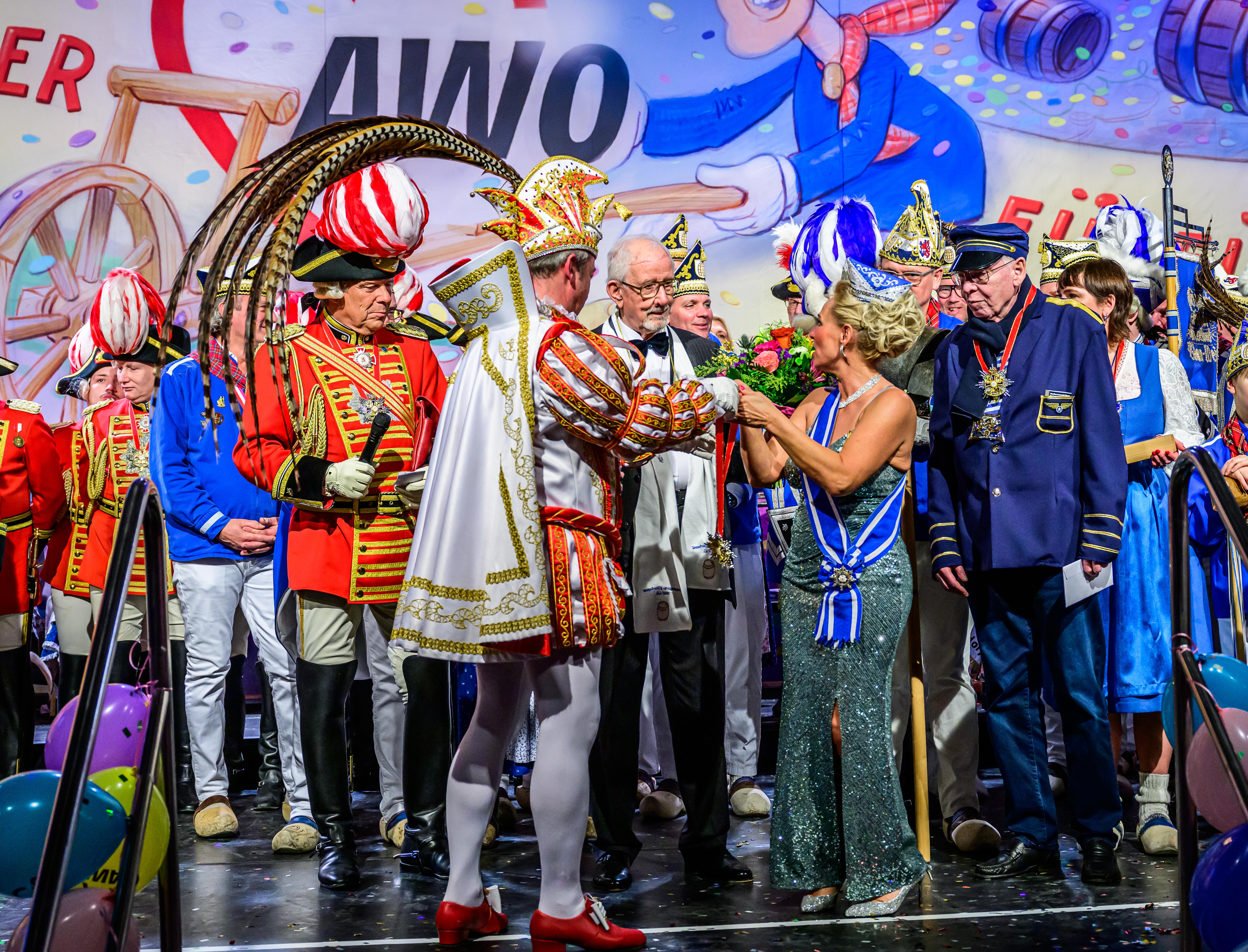Nach der offiziellen Begrüßung um 13.44 Uhr durch den AWO-Kreisvorsitzenden Manfred Abels machte Bauer Schulte Brömmelkamp mit pointierten Alltagsbetrachtungen den Auftakt. Direkt im Anschluss brachten die Musiker von „Alt Schuss“ den Saal zum ersten Mal zum Kochen. Die nachfolgenden „Willi und Ernst“ sind als Büttenredner mittlerweile eine Art Stammgast bei der Sitzung – da blieb kein Auge trocken. Auch die KG Regenbogen ist eine feste Größe in der AWO-Sitzung. Sie überzeugte einmal mehr durch tänzerische und gesangliche Spitzenleistungen. Und siehe da: Beim Abschlusslied stand plötzlich Prinz Andreas II. auf der Bühne und sang kräftig mit. Kein Wunder – der Prinz ist Teil der KG Regenbogen.