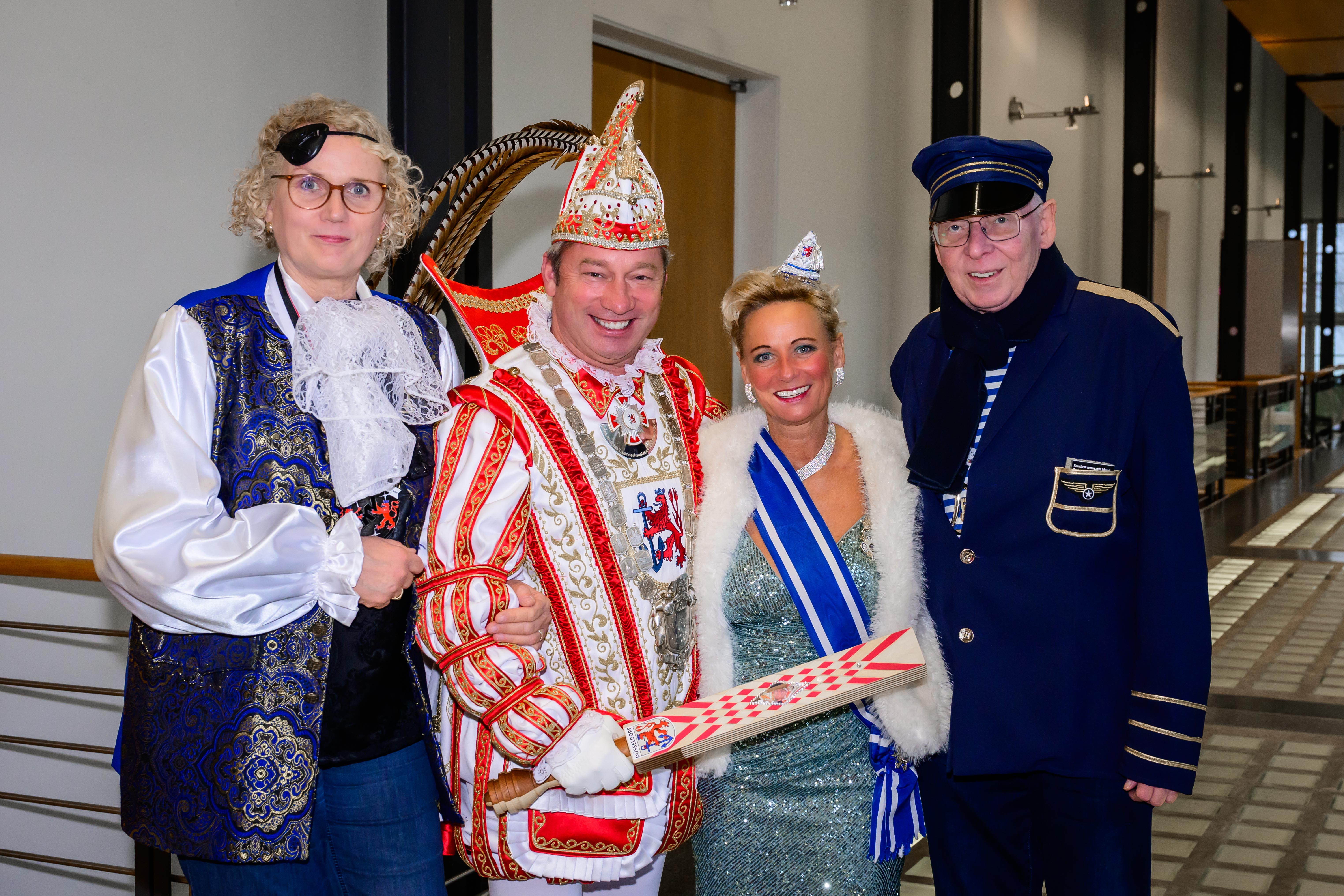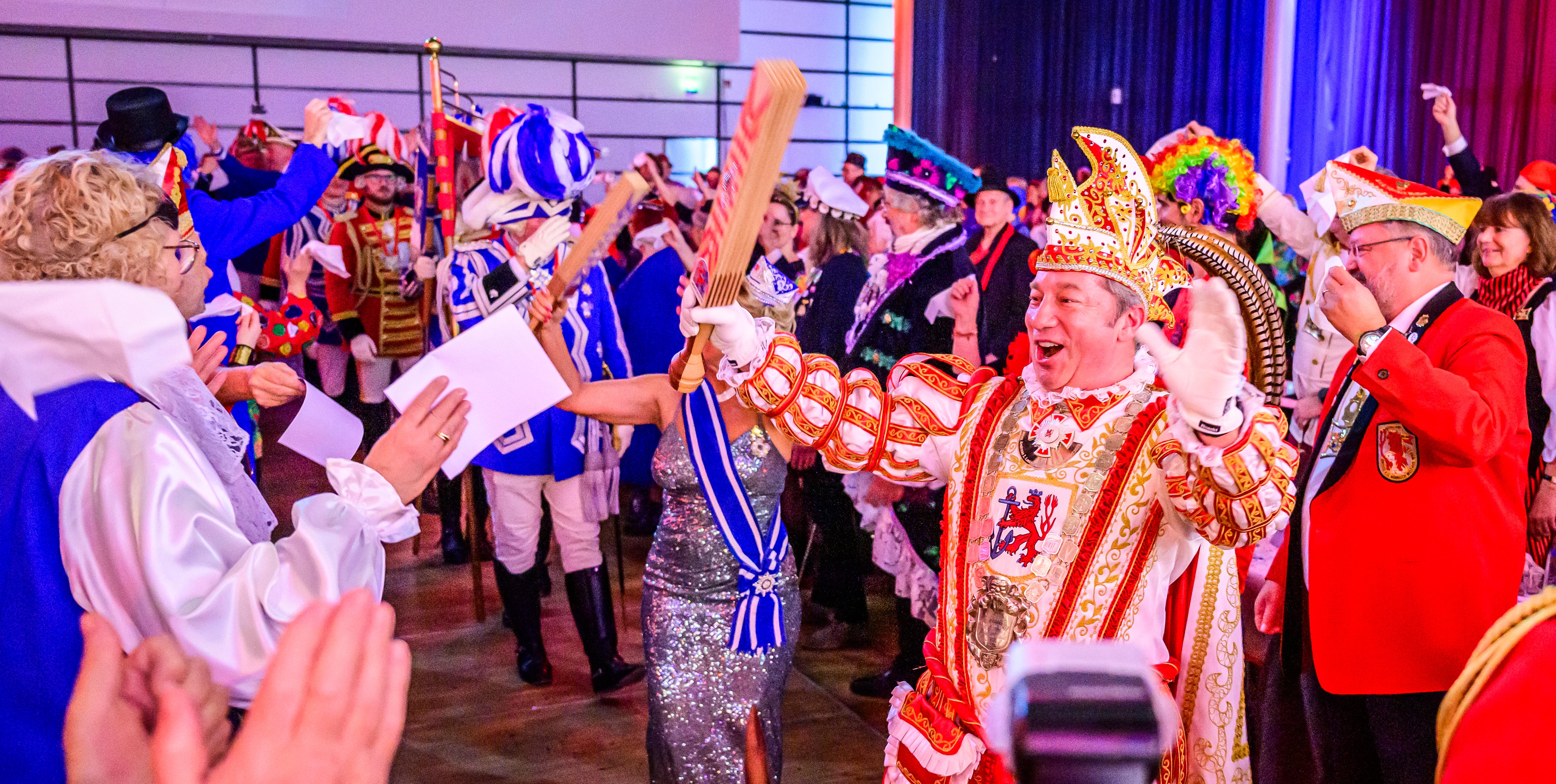 Kurze Zeit später zogen dann Prinz und Venetia samt Gefolge offiziell in den Festsaal – der absolute Höhepunkt jeder jecken Sitzung. Jetzt hielt es Niemanden mehr auf dem Sitz und der Saal bebte. Damit aber nicht genug: Für Furore sorgte das 80(!)-köpfige Ensemble der „Rheinmatrosen“. Obwohl (oder gerade weil) im Kölner Karneval beheimatet, überzeugten die Tänzerinnen und Tänzer durch akrobatische Höchstleistungen. Den Abschluss einer begeisternden Sitzung bildeten wie im vergangenen Jahr die „Swinging Funfares“. Sie heizten dem jecken Publikum noch einmal richtig ein.