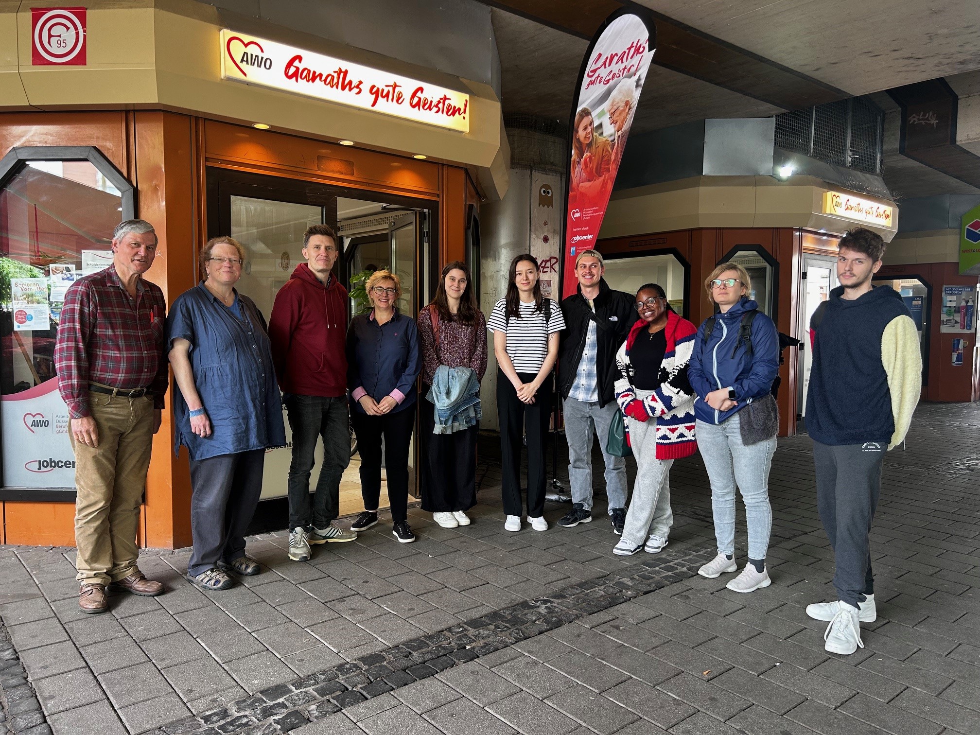 Besuch im Düsseldorfer Süden: Prof. Dr. Christoph Gille, Lehrender an der Hochschule Düsseldorf (HSD) mit dem Fachgebiet „Soziale Arbeit in Kontexten von Armut und Ausgrenzung“, besuchte mit Studierenden jetzt „Garaths gute Geister“ (GgG), ein Projekt der Stadt Düsseldorf und des Jobcenters, durchgeführt vom AWO Berufsbildungszentrum mitten in Garath. Auf dem Programm standen Informationen über die Arbeit der AWO für Düsseldorf, die Leistungen des BBZ im Bereich Arbeitsmarktintegration/Jugendberufshilfe – und natürlich die Tätigkeiten der GgG vor Ort in Garath.