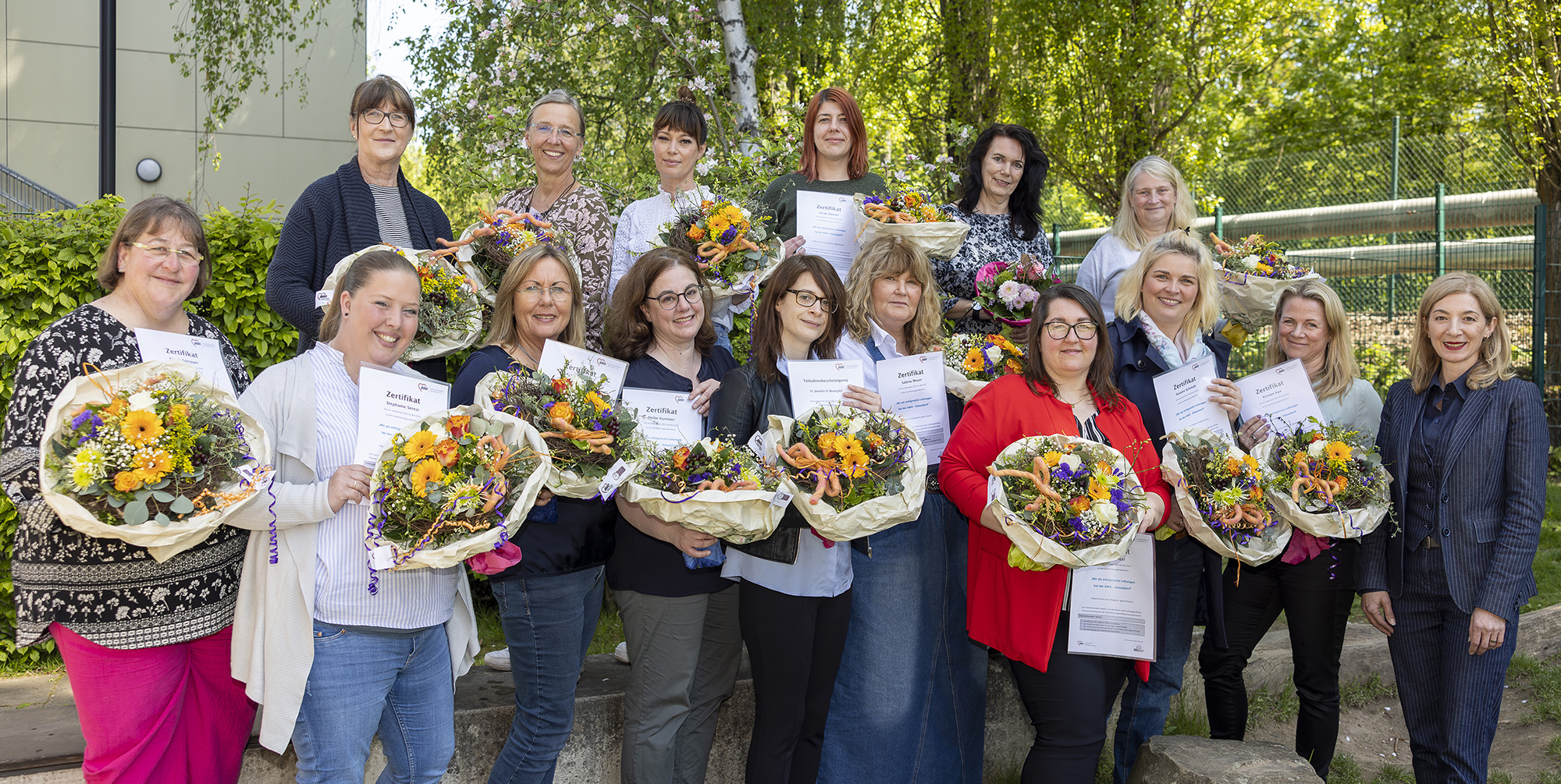 Unter anderem befassten sich die 32 Teilnehmerinnen mit ihrer Rolle als Leiterin sowie den Themen Teamentwicklung, Personalführung und –entwicklung, Zeit- und Selbstorganisation. Zum Abschluss präsentierten die Teilnehmerinnen Inhalte aus der Weiterbildung, die sie schon in den Einrichtungsalltag integrieren konnten.