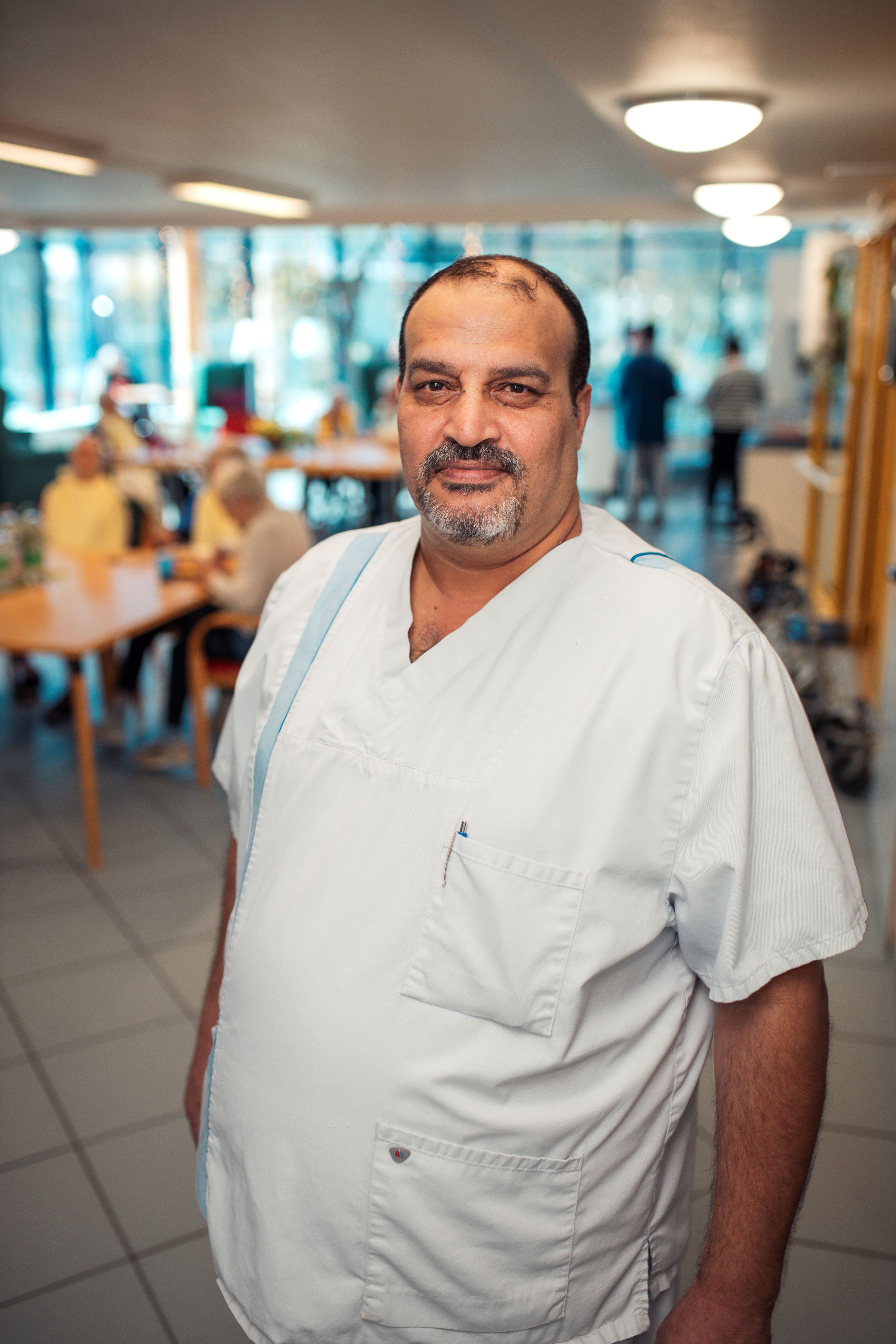 Mohamad Alfalah: Eigentlich bin ich gelernter Diplom-Ökonom. In Syrien habe ich eine Fabrik für Bekleidung geleitet. Nachdem ich die Sprachkurse absolviert hatte, wurden mir vom Jobcenter zwei Angebote gemacht: die Arbeit in einer Security-Firma und die Arbeit in der Altenpflege. Ich habe mich dann sehr schnell für die Pflege entschieden – und das aus mehreren Gründen. Meine Eltern sind heute noch in Syrien, inzwischen habe ich sie elf Jahre nicht gesehen. Ich mag Senior*innen und die Arbeit mit ihnen – das tut mir gut und ist gut für mein Herz. Ein bisschen sind die alten Menschen in meiner Einrichtung wie meine Eltern für mich.